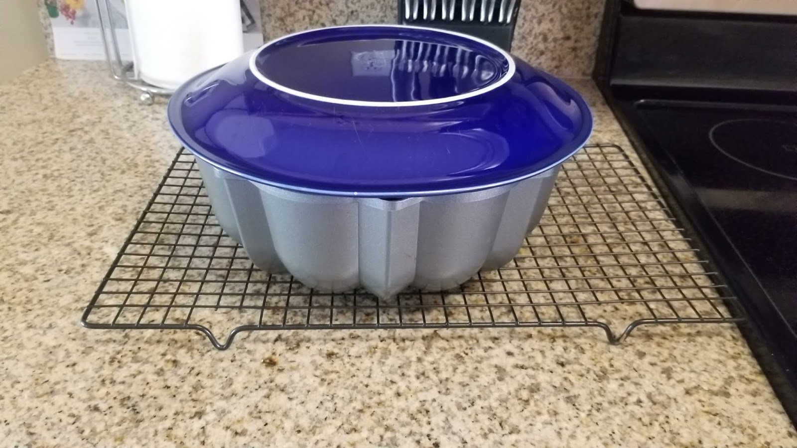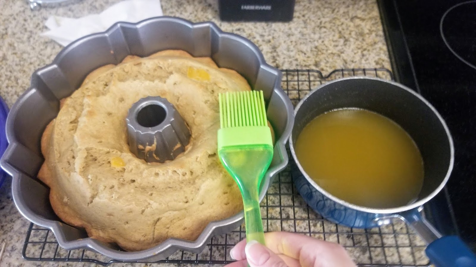 Pour your batter into the prepared pan, smack the pan on the counter to get out any air bubbles and even out the batter. Bake for 45 minutes at 325 until a toothpick comes out of the deeper parts of the cake clean. When there’s about 10 minutes left on the oven timer, it’s time to make the buttery glaze. Be sure to put your cake on a cooling rack when it’s done in the oven, leaving it in the pan.