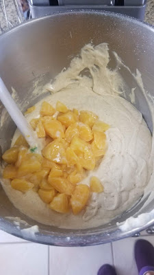 Then, by hand, fold the diced peaches into the mixed cake batter. Once everything is nice and evenly folded, you’re ready to do battle with that bundt pan.