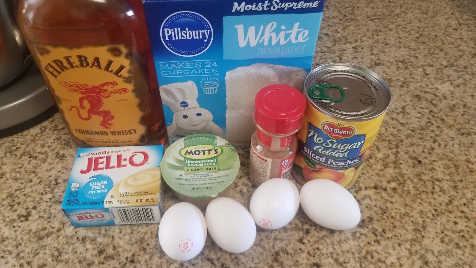 Start by preheating your oven to 325 and greasing a bundt pan with like a gallon of cooking spray. Mix the cake mix, pudding, cinnamon, eggs, applesauce, Fireball, and water together in a stand mixer on medium high for 2 minutes. Prepare your peaches while this is mixing.