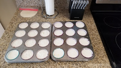 I used a cookie scoop and placed two scoops of batter into each cupcake liner. I baked these for 20 minutes, until they had a nice white but slightly golden top. Place your trays on top of cooling racks and let cool for 10 minutes, until you can handle the pan by touch.