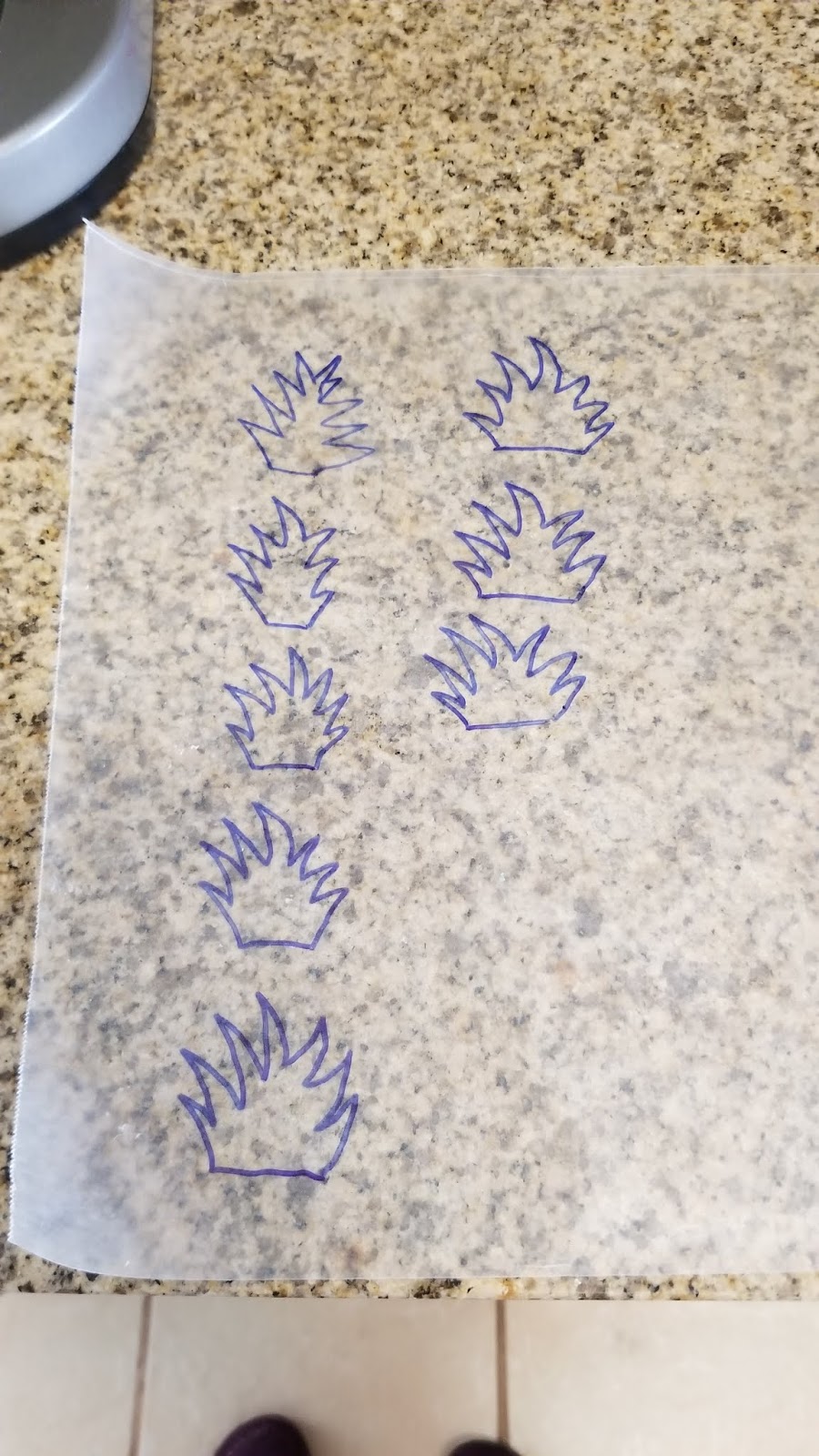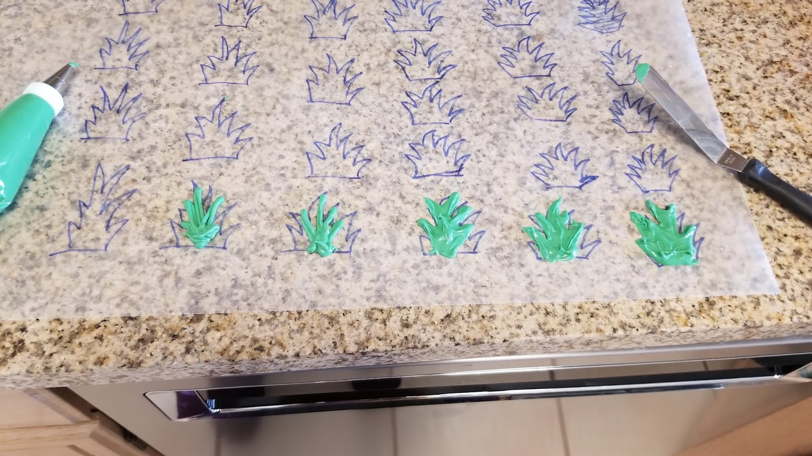I free-handed about 30 little pineapple tops onto a sheet of wax paper with a Sharpie while my chocolate cooled. I’m no artist when it comes to drawing, so use a template if you’re feeling antsy. I flipped over my wax paper so it was Sharpie-side down.