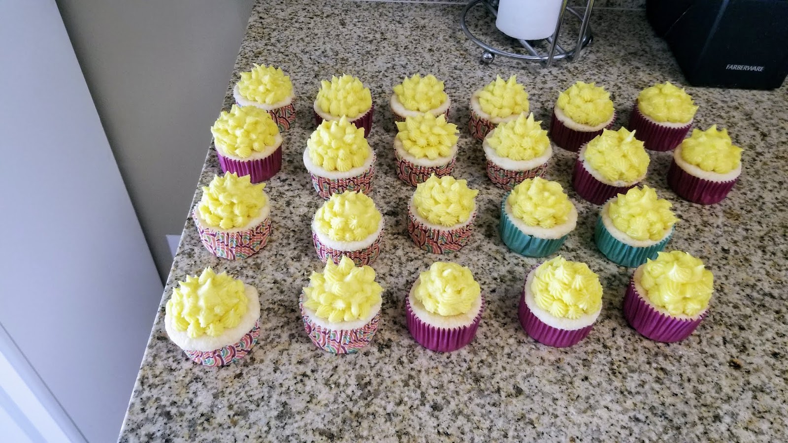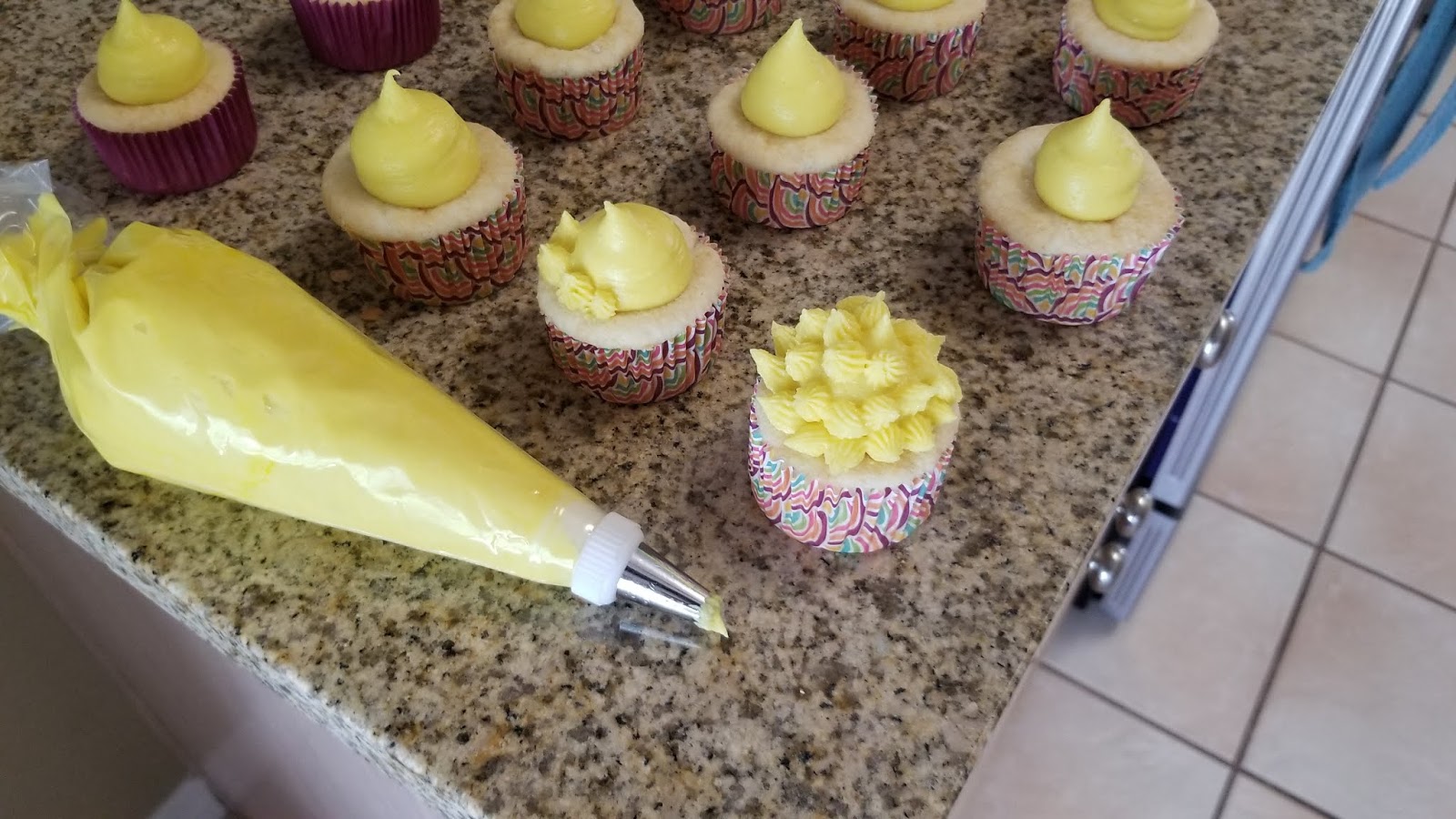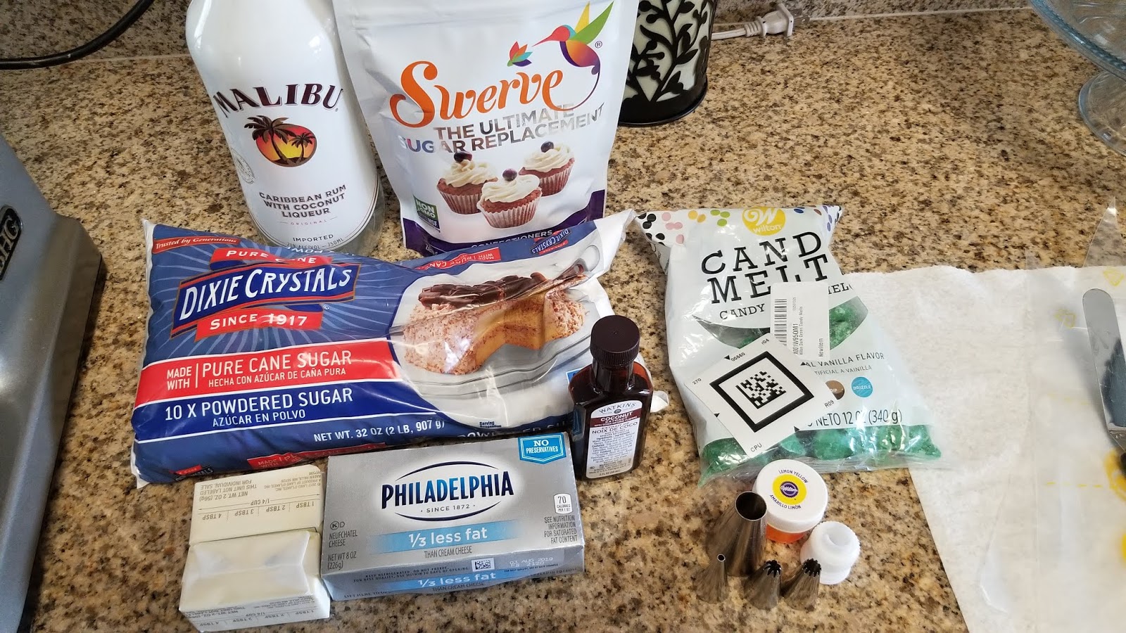 Mix together the cream cheese and butter for 1-2 minutes until well combined. Then add 2 cups of Swerve and the coconut extract, blending well. Add in the 2 cups of powdered sugar, 1 TBS of rum, and yellow gel dye. Blend well. If you want a stiff piping consistency, DO NOT add more rum. Full disclosure, I made these back in May and added 3 total TBS of rum to my frosting, and it was way too runny to pipe with, so I just smattered them in frosting and ate them anyway. I knew I wanted to share this recipe because it was way too good not to, and I was most definitely ready to eat them again based on taste memory alone, so, here we are.