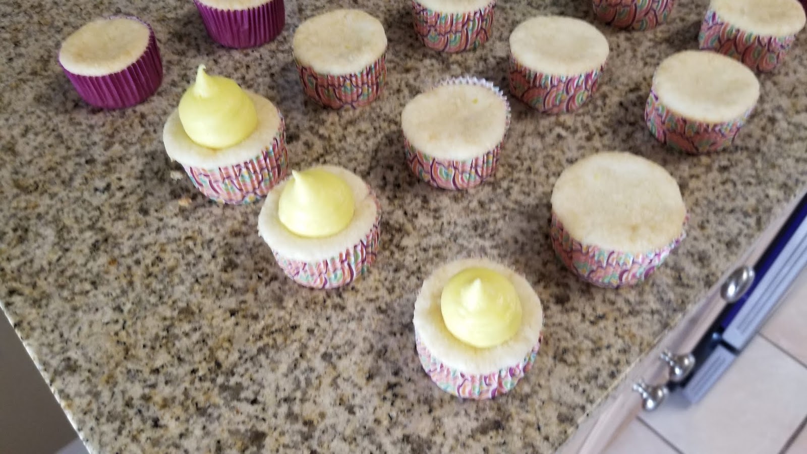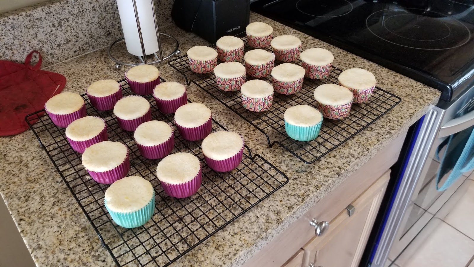 I used a cookie scoop and placed two scoops of batter into each cupcake liner. I baked these for 20 minutes, until they had a nice white but slightly golden top. Place your trays on top of cooling racks and let cool for 10 minutes, until you can handle the pan by touch.