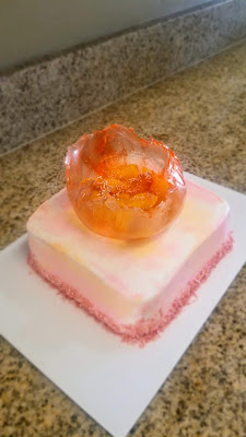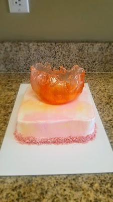 The dismantling of the balloon is not easy, and it is a tension-filled minute while the water drains. But the end result is a pretty nifty looking bowl for you to put on top of your cake and add more peaches and sprinkles to. You could eat it if you wanted to, but I imagine it just takes like pure sugar and nothing else, so that’s a hard no from me. You can see my edges are pretty jagged from having to chip away to remove the bowl from the balloon, so I am definitely trying this again with ceramic to see if that achieves a cleaner look. It’s still pretty awesome with the swirled peach dye in there. As for clean up, let your kitchen sink run hotter than the surface of the sun as experienced from Florida, and place all your tools into the saucepan you used to make the candy syrup. For 5-7 minutes, run water in the saucepan, and under all that heat, the tacky candy will pretty much just melt right off. Small miracles.