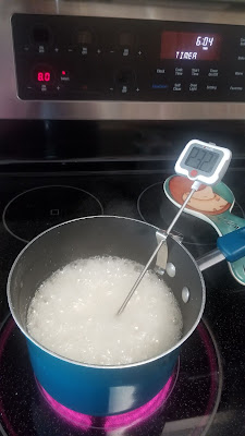 Now, dump your sugar, water, and corn syrup into a medium sauce pan. Working at medium-high temperature, whisk together your ingredients then let it heat up to 305 degrees. This part takes 12 minutes, but you don’t need to stir continually. I had a timer going so that I whisked the mix every two minutes. Keep a very close eye on your temperature the last two minutes…it can go from 250 degrees to 305 VERY fast, and you don’t want to burn the mixture. Once it hits 305, remove from heat and stir in the gel dye with a toothpick. I swirled so it wasn’t totally mixed into a solid color but instead had streaks of peach.