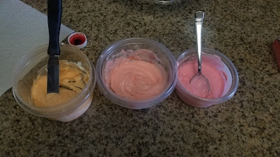 | Now, take three small bowls and add a large dollop of frosting to each. |