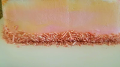 You can now put the cake in the fridge to crust up for about 15 minutes, then come back in with a Viva paper towel to smooth out any rough edges. I have a horrible time trying to make the corners on square and rectangle cakes look nice, so this paper towel trick is an absolute must to make my cakes look nice. After smoothing out a bit, the frosting had become malleable again, so I placed it on a large baking sheet and then pressed handfuls of sprinkles into the sides of the cake for a border: