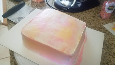 Now take a dab of each color and layer it on the cake in a random pattern. I did this staggering in vertical columns on the sides of the cake, and then just haphazardly on the top. Take your bench scraper or angled spatula and run along the sides and top of the cake, allowing the coloring to blend together with each pass. You can do one or two passes to keep the coloring still somewhat separate and more of stark contrast. I wanted to pass over about 4-5 times to really blend things together and make it look more like a nice glass full of peach Bellini in cake form. Practicing what I peach, if you will.