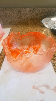 Let these set up for at least 30 minutes. Then very carefully pry the balloon out of the bowl. Like I said, I had to chip away at the candy hardened onto my bowls to get the balloon out. If you use a ceramic bowl that’s oiled, you probably won’t have this problem. You will want an extra set of hands (wearing gloves or holding wax paper so there’s no moisture) to gently cradle the balloon while you very carefully pull the tied end of the balloon tight and snip with scissors to create a small slit for the water to slowly drain out of…hold the balloon at an angle so the candy doesn’t get wet. If it gets wet, it will get tacky and start to break apart.