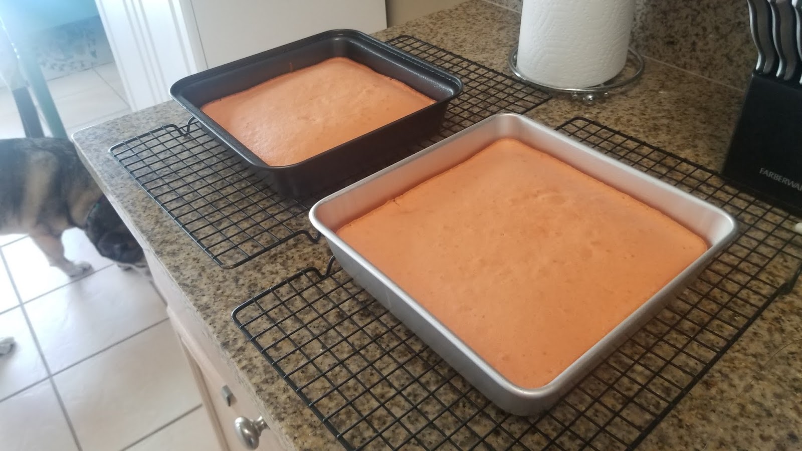 Start by preheating the oven to 325 degrees and greasing two 8-inch square pans. Mix everything but the peaches together in a stand mixer on medium for 2 minutes. Champagne will make things bubbly, so don’t go too high on the mixer speed or you’ll end up wearing some of your batter (lesson learned the hard way). Fold in the peaches and a couple drops of peach gel dye if using. Pour into prepared pans and bake for 28-30 minutes, or until a toothpick comes out of each cake completely clean.