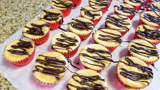 I poured my 2/3 cup of chocolate chips in a bowl and heated for 1 minute on 70% power in my microwave. I gave them a stir and added another 30 seconds on 70% power before they were nice and melty without getting scorched. I poured this into a piping bag (a large plastic baggy works, too). I put down Parchment paper, grabbed my cheesecakes from the freezer, and then snipped the tip of the piping bag off. I literally just drizzled back and forth several times across ALL cheesecakes (quick, extremely messy, but you get to eat dried chocolate when you’re cleaning up later).