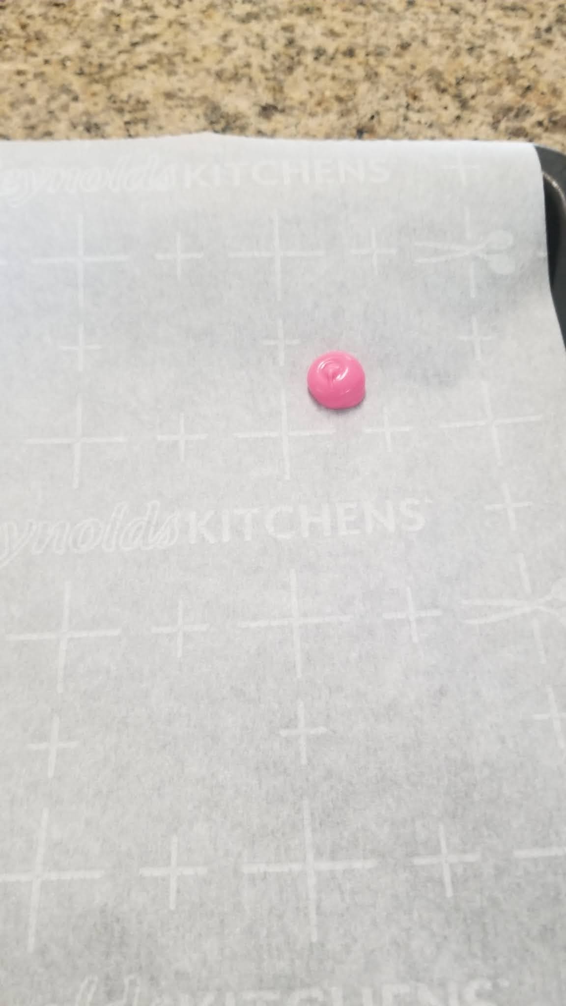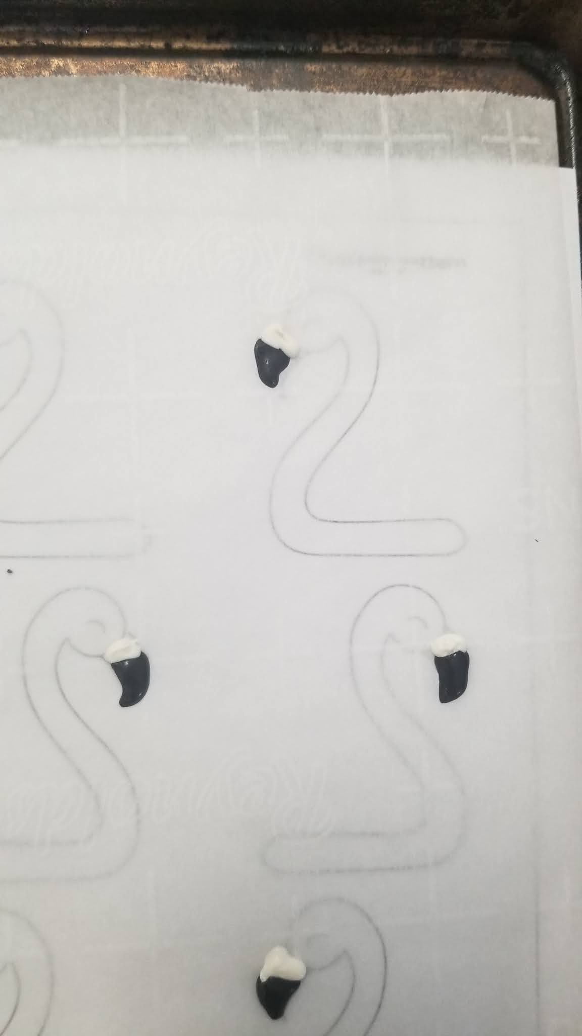 You need white, black, and hot pink candy melts as well as hot pink gel dye (this is only for the frosting). You need three piping bags and three #2 or #3 open round decorating tips for piping the chocolate. I melted 30 grams of white chocolate and 30 grams of black chocolate in separate small Tupperware bowls for 1 minute at 50% power in my microwave. Give each a good stir until totally melted, then load each into their own piping bag. You will have a lot of leftover melted chocolate if you’re only making 12 heads, just FYI.