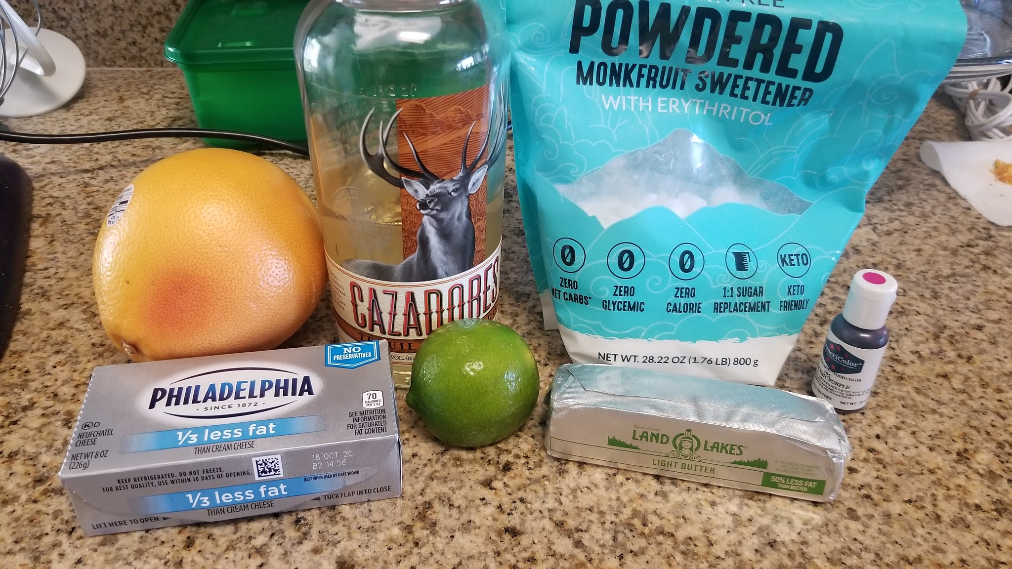 While your cupcakes are cooling and flamingo body parts are setting, it’s time to bust back into the booze and make some frosting! For the Paloma cream cheese frosting, you need: