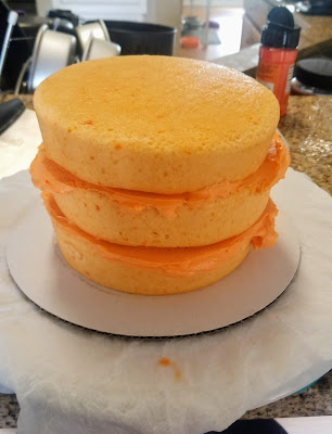 Start by mixing the butter and cream cheese on medium high for 2-3 minutes, until light and fluffy. Add in 2 cups of Lakanto, orange and vanilla extracts, and blend on low until fully mixed. Then add in the remaining 2 cups of Lakanto and 2 tsp of milk. Blend fully, and then take a heaping amount of frosting (I used 10 ounces), and set it aside in a medium bowl. Once this is done, add several dollops of orange gel dye to the frosting left in the stand mixer bowl. Mix well, and turn your attention back to the reserved frosting. Add the black cocoa, final teaspoon of milk, and some black gel dye to this, mixing by hand. Now, we’re ready to assemble!