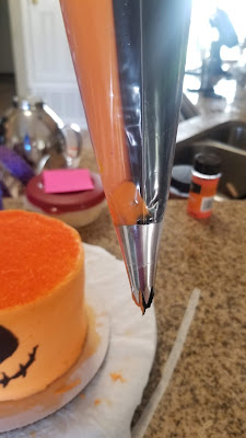 I placed my remaining orange frosting in one piping bag and the black in another. Then in a larger piping bag fitted with a 1M tip, in both of these bags went. I piped out a few dollops on a paper towel until the colors were both coming out evenly.