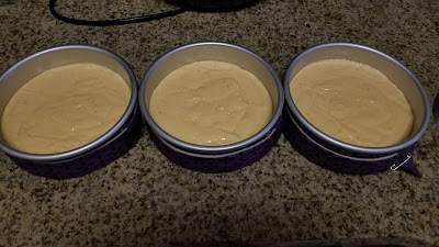 | Now, evenly pour your batter between all 3 pans. |