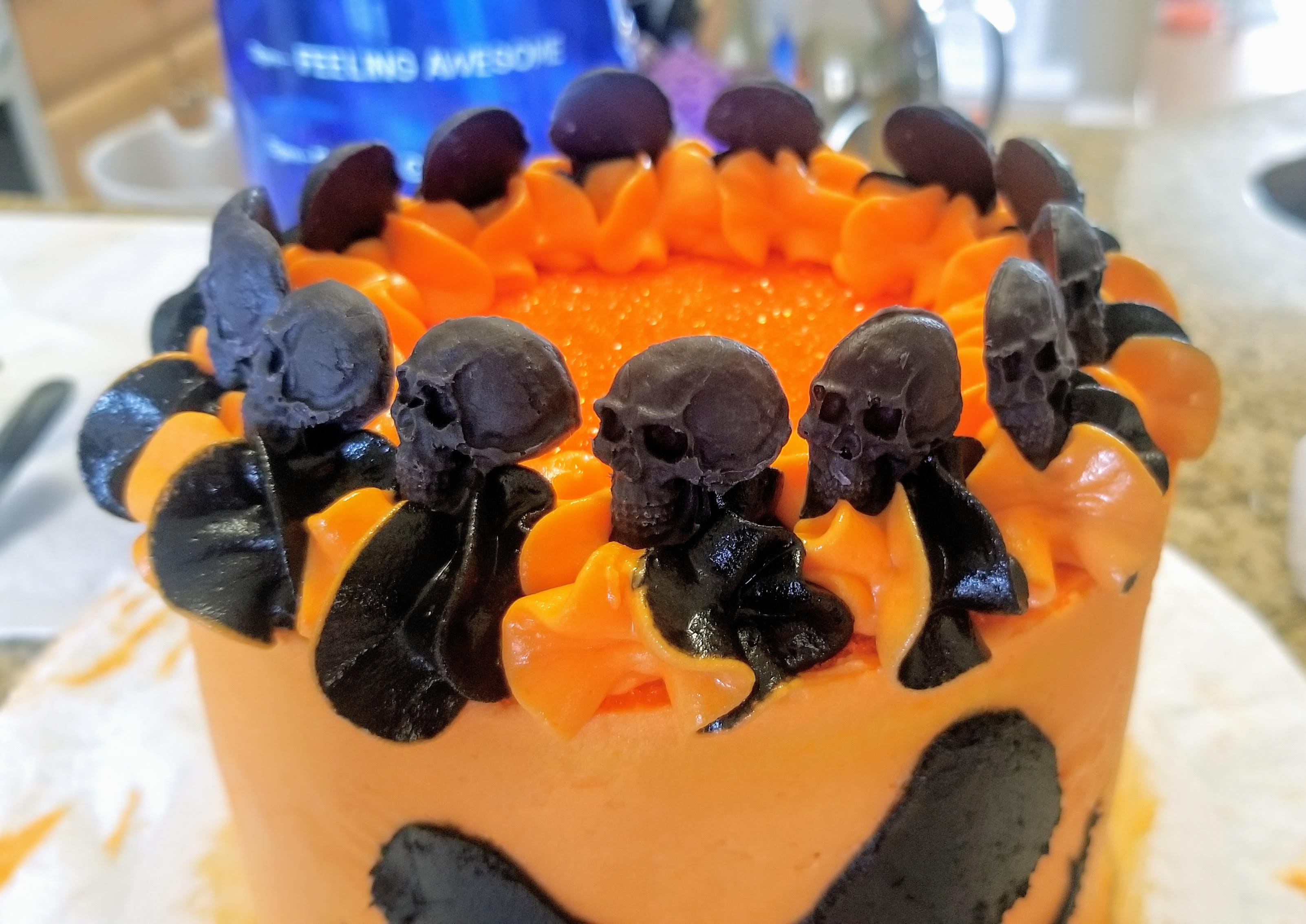 Put your first layer of cake face down on a cake board. Add a decent layer of frosting to the top of it smooth out, and repeat with the next layer. Add the final layer on top, then cover the cake completely in orange cream cheese frosting. Be sure to reserve some orange frosting for the swirls on top. I ended up with a bunch of leftover frosting (both orange and black), and I have it in Ziplocks in the freezer for the next time I just need to eat frosting and nothing else (I refuse to believe I’m the only person who does this).