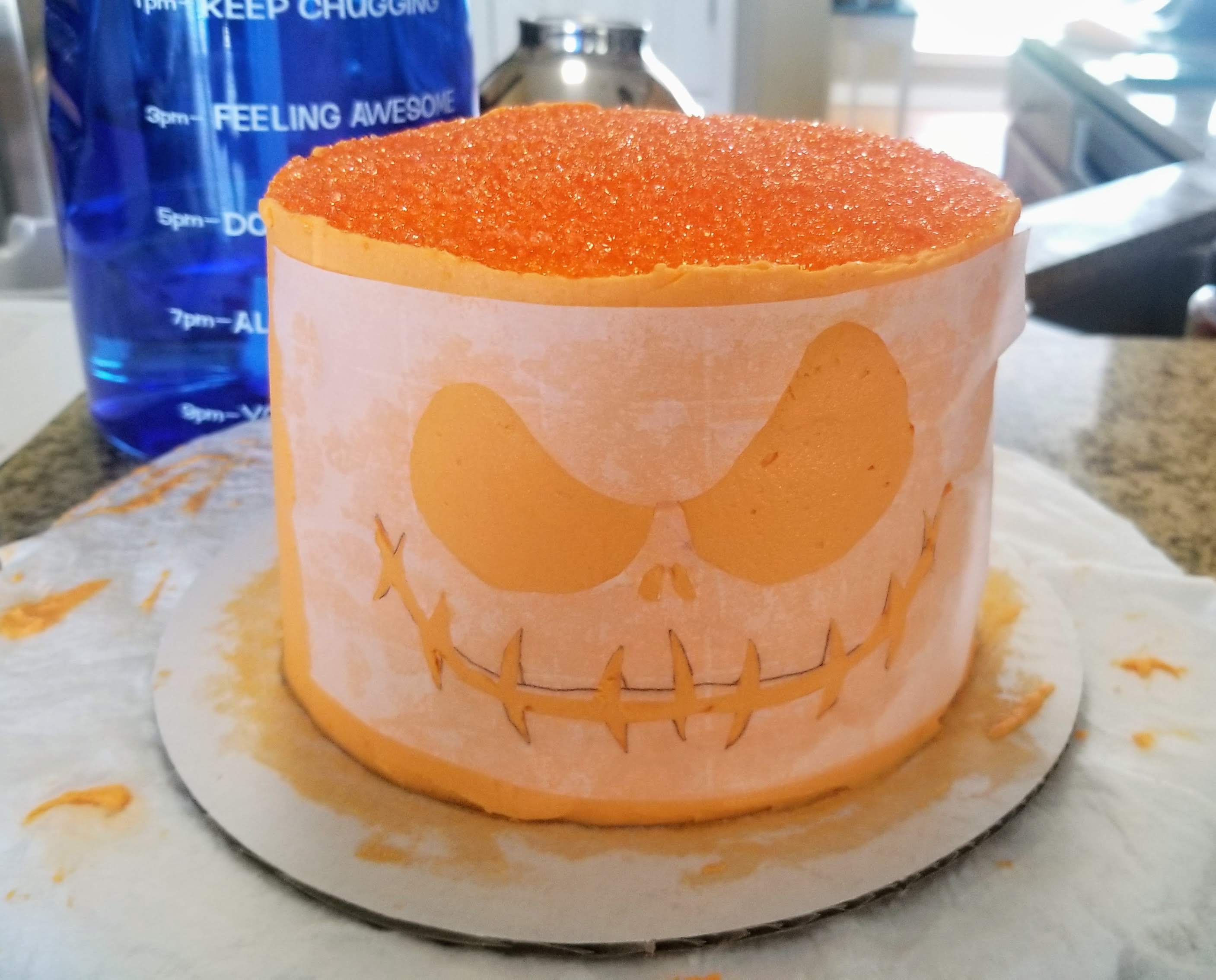 Once you’ve smoothed out the sides and top of the cake, very carefully pour the orange sprinkles on top, using light pressure with your fingers to get it to stick in place. This is a crusting frosting, so you can use the paper towl trick to smooth out imperfections once you’ve chilled your cake for 30 minutes.