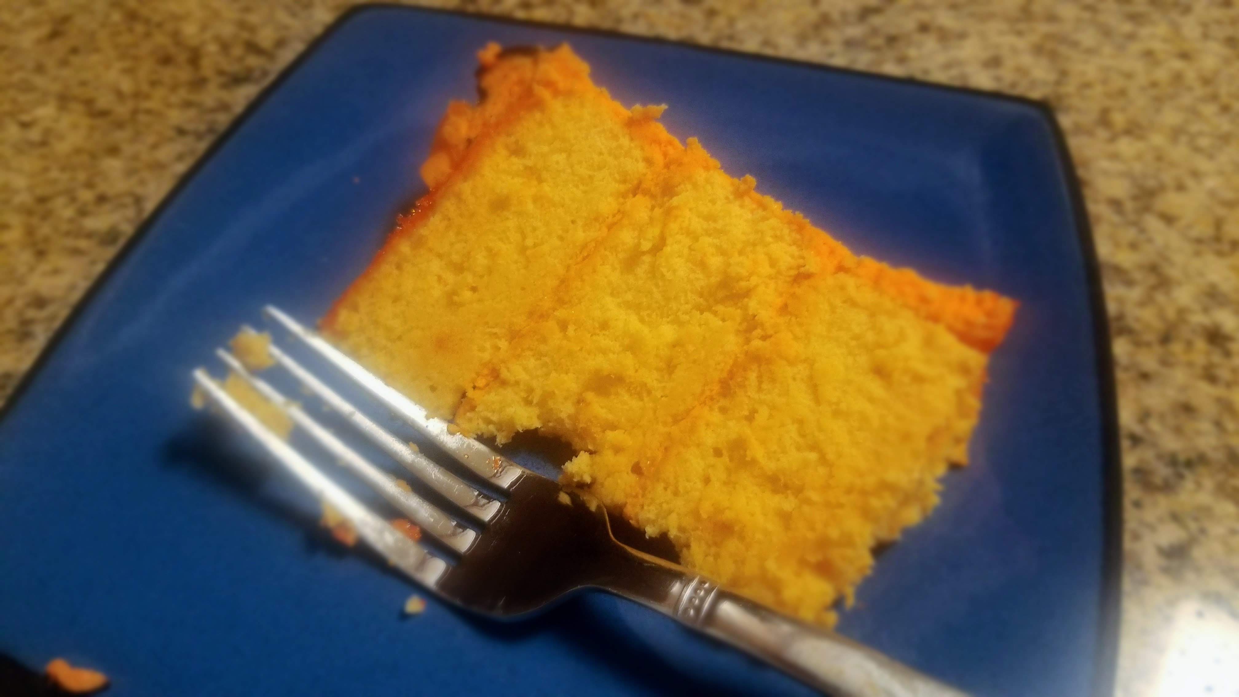 Preheat your oven to 325 and grease 3 6-inch round pans with cooking spray and bake even strips. Dump all your ingredients into a stand mixing bowl, blending on low for 30 seconds, then bump the speed up to medium-high for 2 minutes. Thanks to the orange Jell-o, you don’t need to add any food coloring to make this cake pop with orange coloring.