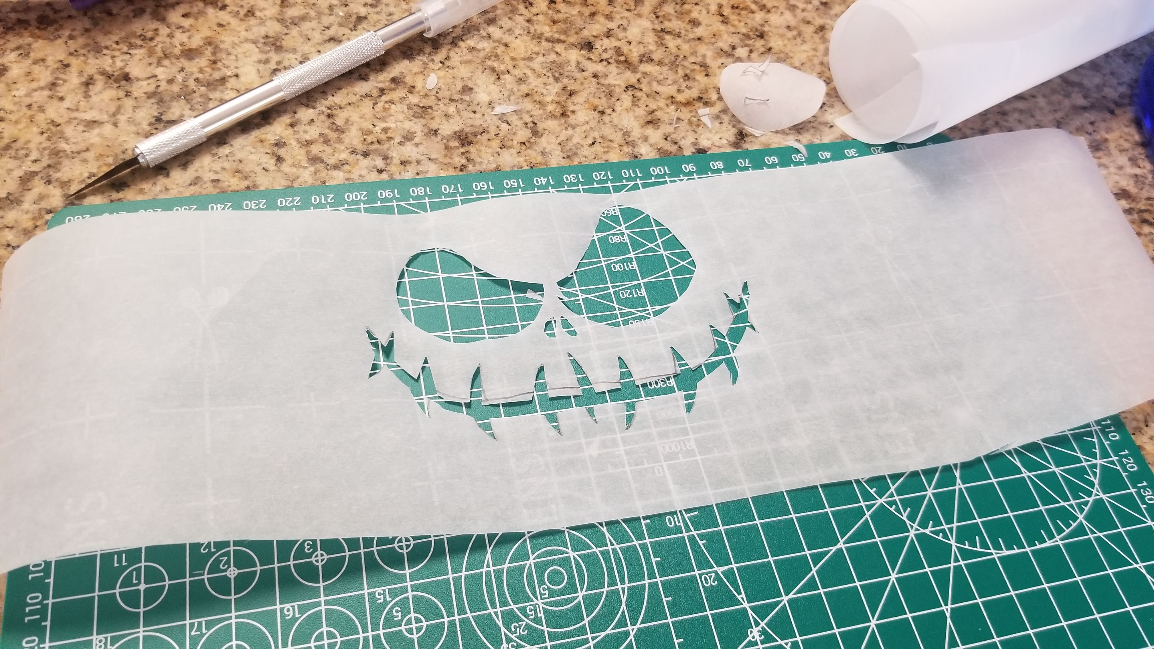 Much like Oogie, I used an X-acto knife and a template on Parchment paper to create Jack’s face. I found this pumpkin carving template online, resized it to fit my cake (I used Canva to resize it, but you could copy and paste into Word or Paint and scale the size up or down as needed), and with the help of my X-acto knife and a cutting mat, I cut out what was needed: