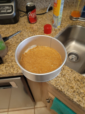 Spray and line an 8-inch springform pan with Pam and Parchment paper. Dump your crust in, and spray your hands liberally with cooking spray because this recipe is STICKY. Press into an even layer and bake at 375 degrees for 12 minutes, then remove and place in the fridge to cool.