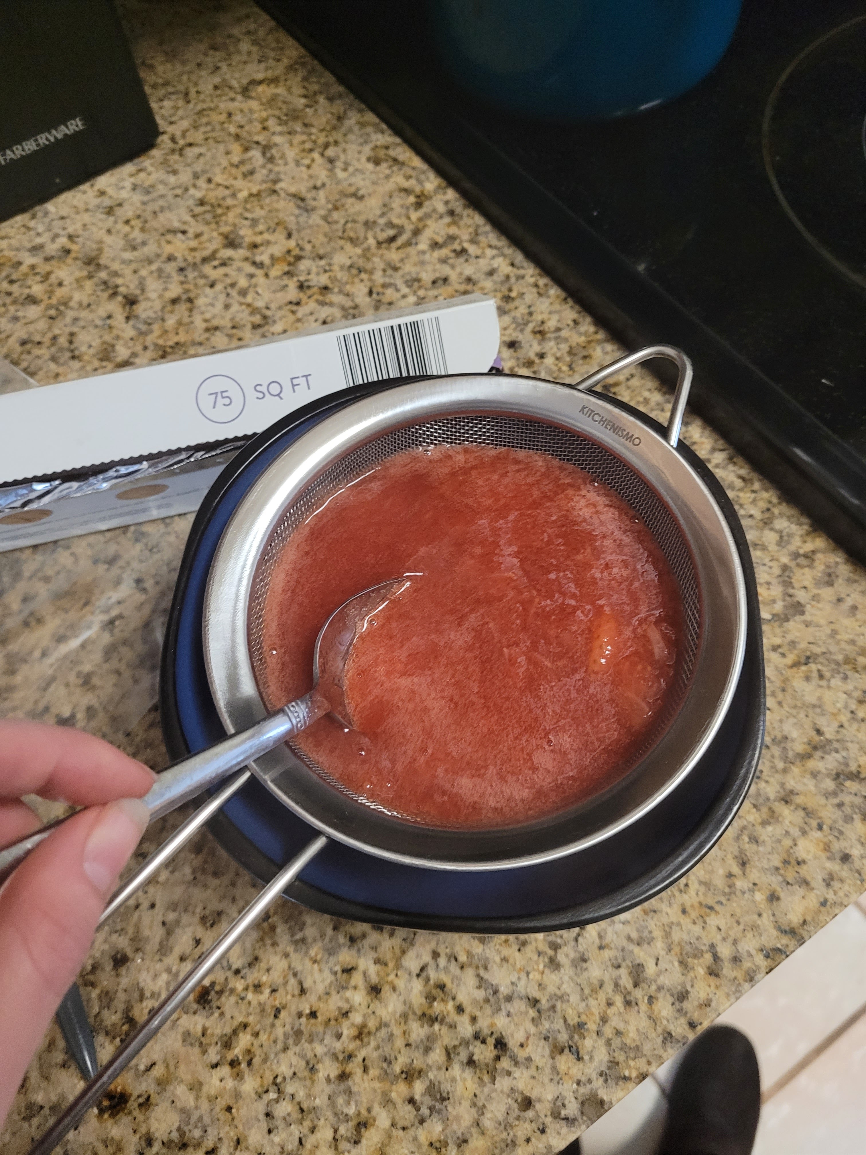 Take your puree and pour it over a seive into a bowl. Use a spoon to gently stir and allow the liquid to drip through, leaving any large chunks of berry behind.