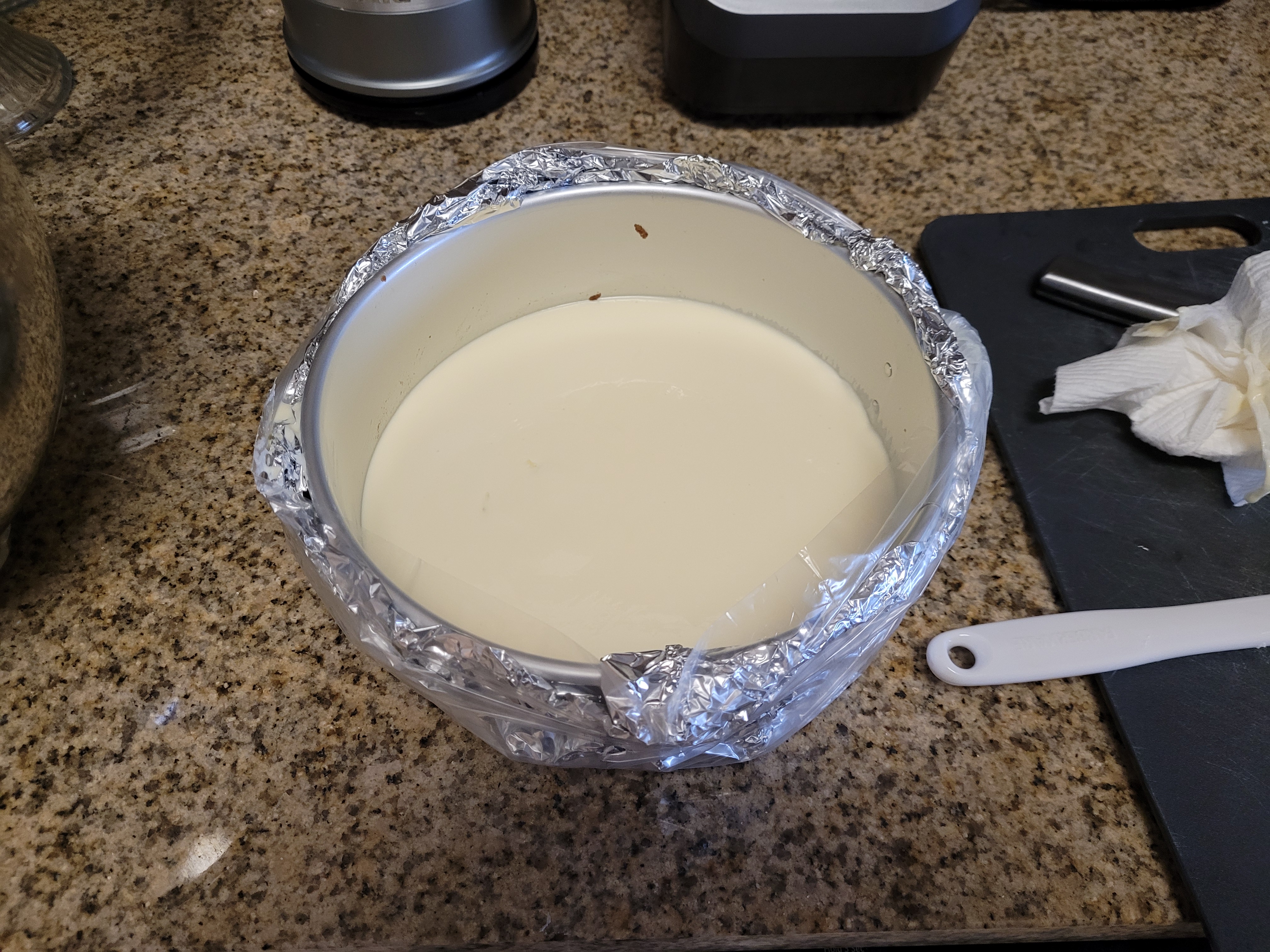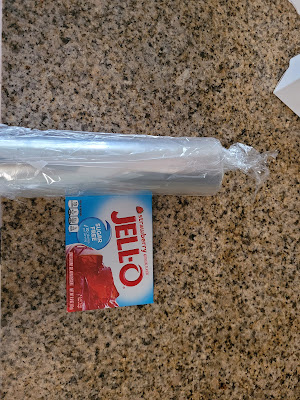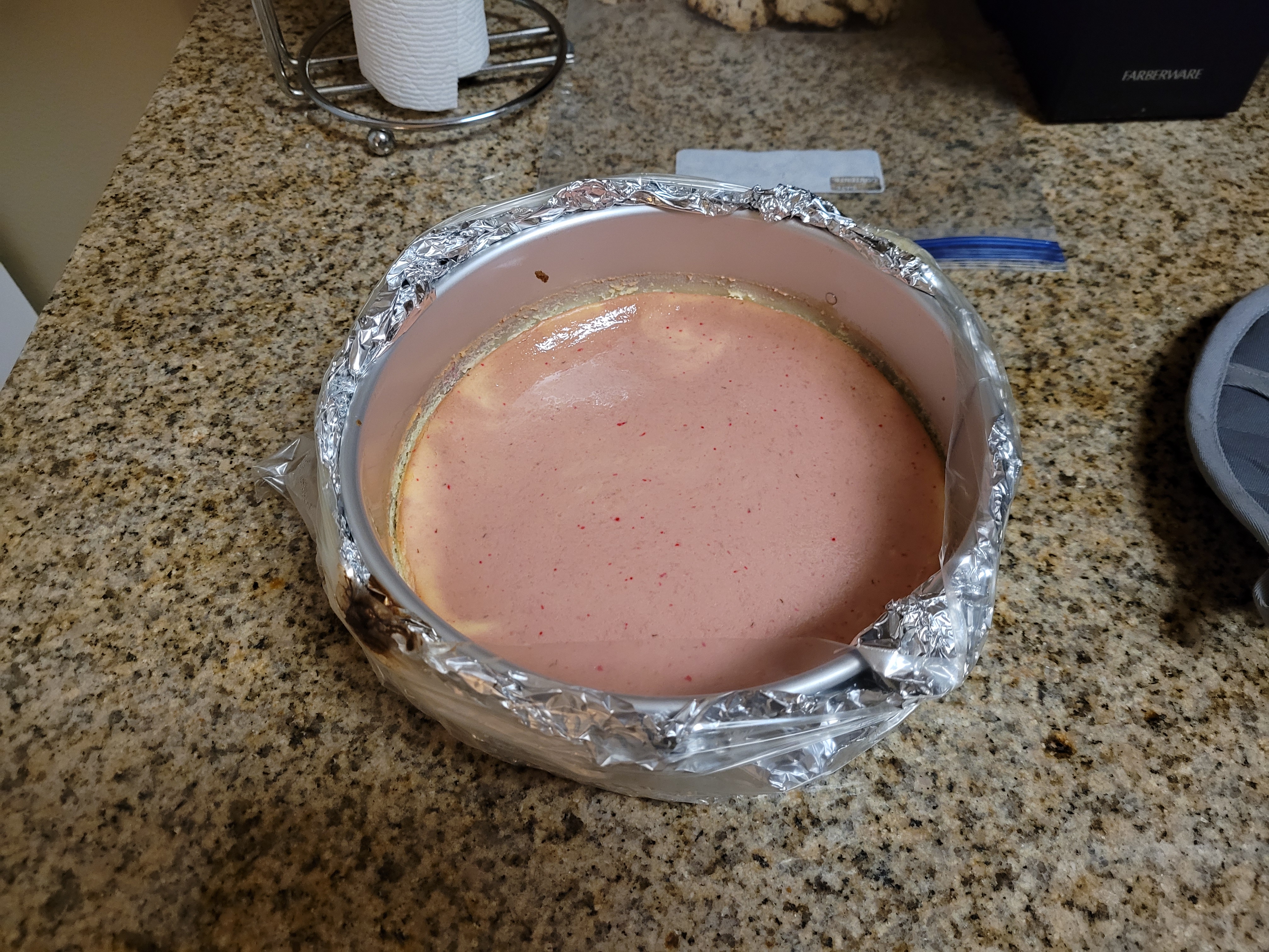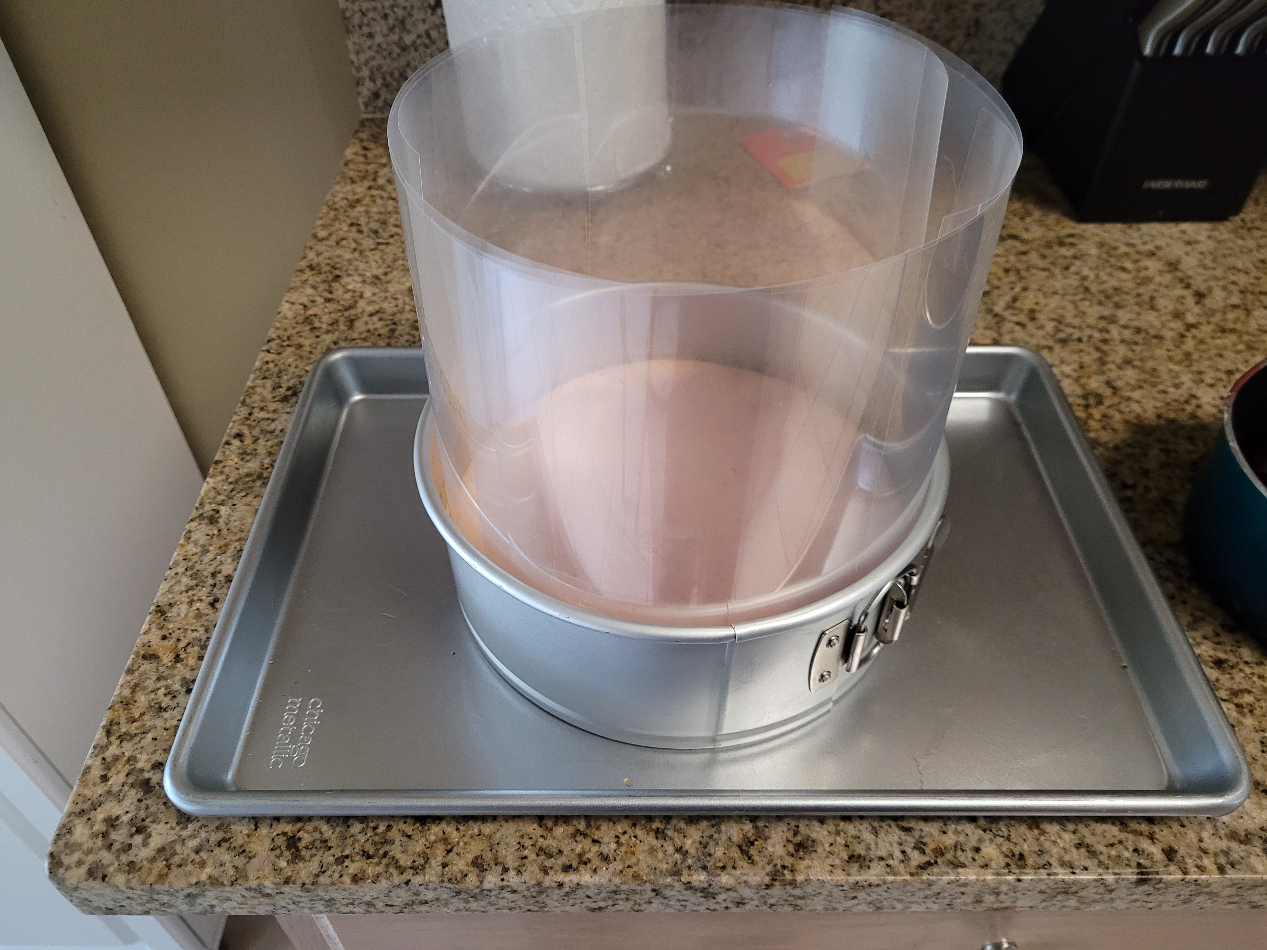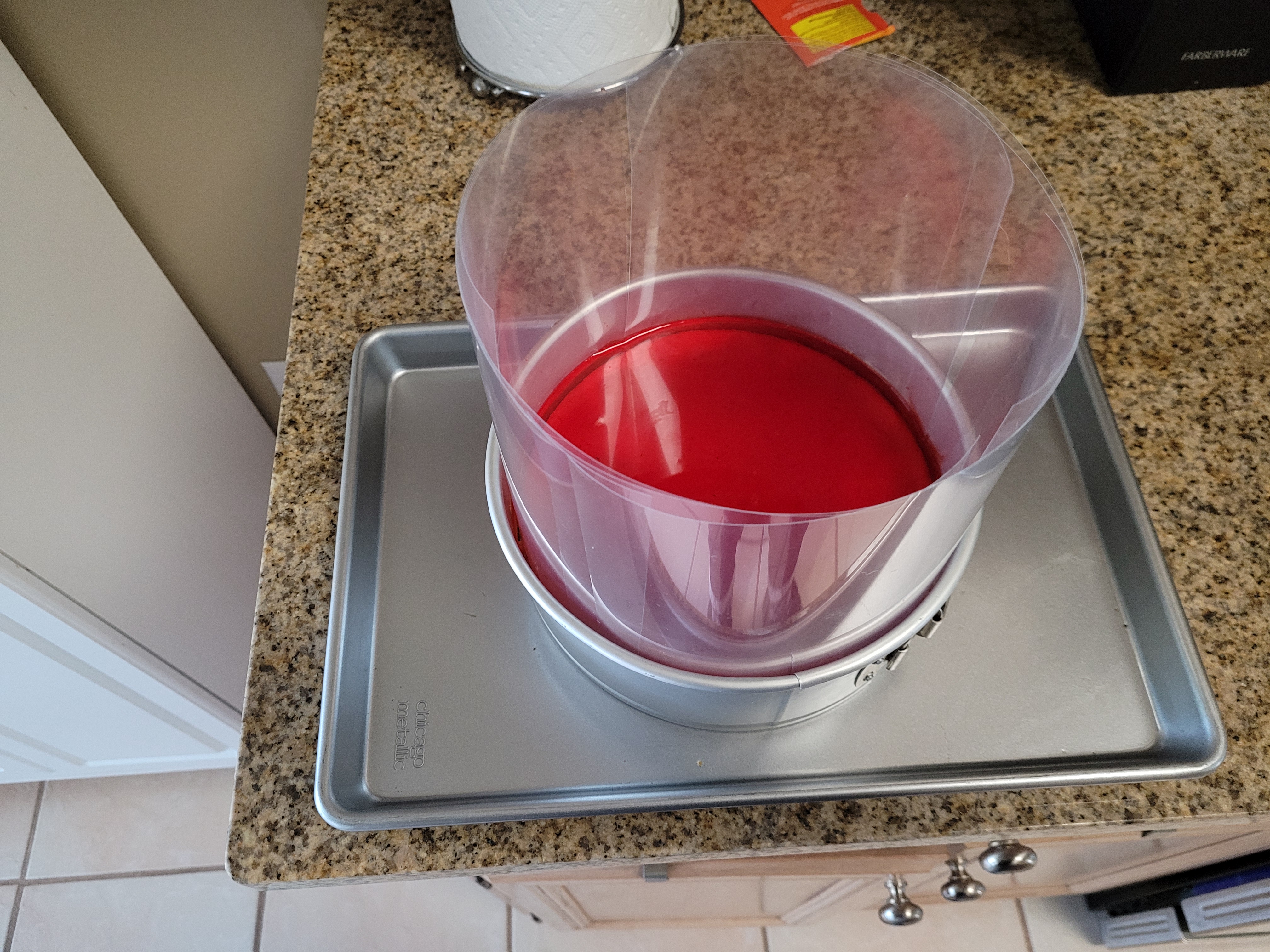 I took acetate and cut two layers that completely ensconced the cheesecake. Very gently wiggle these or some wax paper into the sides of your pan to keep the Jell-o from overflowing out the side of your springform pan. I still placed my springform on top of a cooking sheet in case it did. This cheesecake was not going to best me a second time, oh no. I’m a “plan to fail” kind of person, apparently. I must be delightful at parties. Never invite me over to anything but a wake.