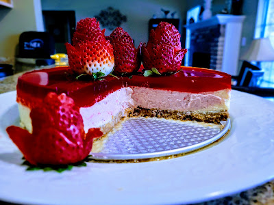 I don’t celebrate Valentine’s Day, but I do look for literally any reason to make a tasty dessert. I really celebrate the day after Valentine’s Day when I can procure 15-30 pounds of chocolate for like three bucks. But since I’m still waiting for that glorious day to come, I knew I needed to get on the ball and make a dessert to help me pass the time. Strawberries and Valentine’s seem to go hand in hand…here’s a piece of fruit that’s sweet as and shaped like your heart! Now eat it! And well, I love cheesecake berry much, so it just seemed like if I’m gonna sorta celebrate the day after Valentine’s Day, I could celebrate the few days before Valentine’s Day with a strawberry cheesecake. At what point do I just admit this is me celebrating Valentine’s Day, you ask? After 2020, do we really want hell freezing over? Because that’s what it would take…