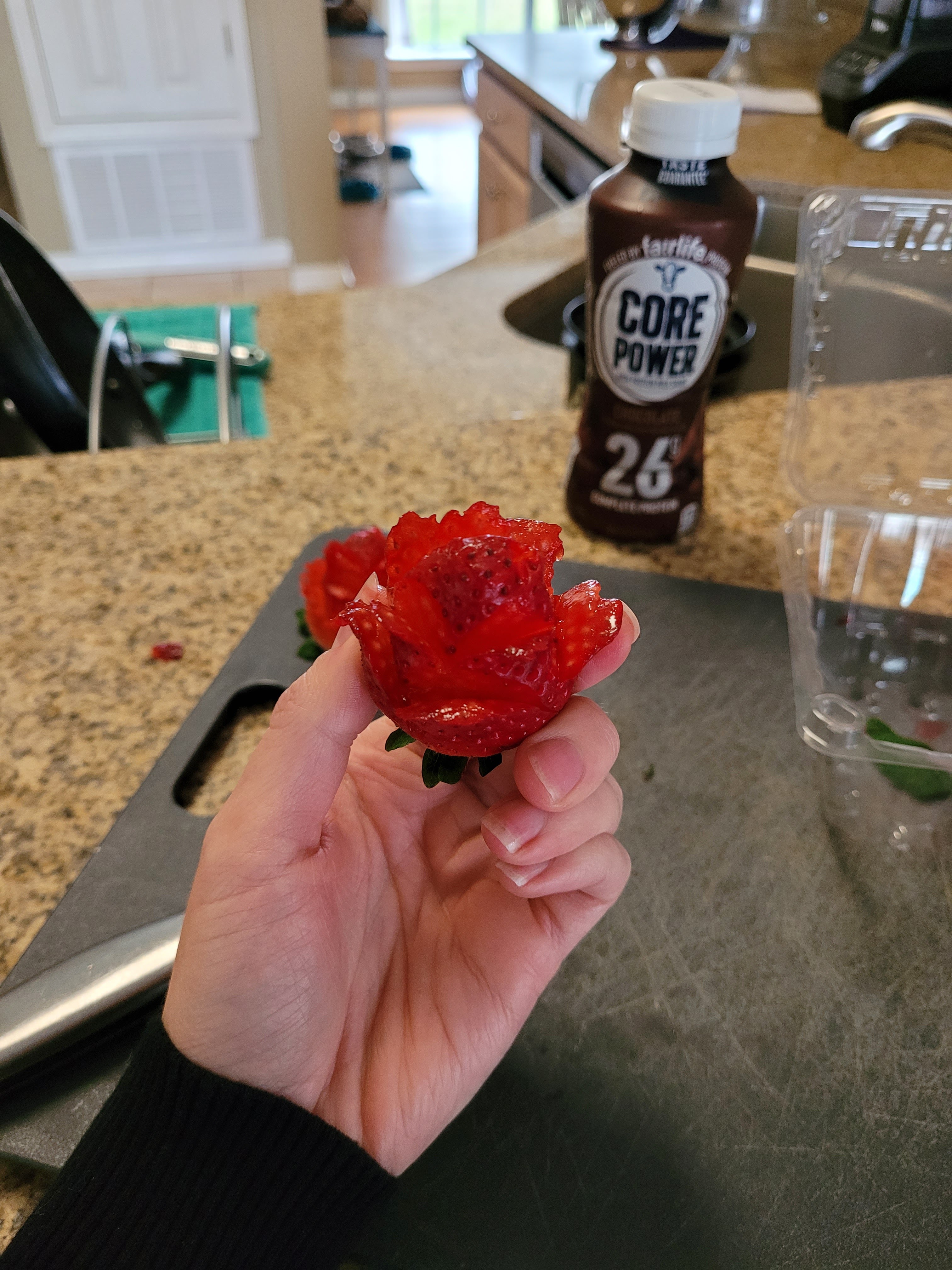 So, clearly, I put either glitter or some sort of accoutrement best described as “extra,” on top of 99% of all my bakes. Here we have no exception. I created strawberry roses with a few leftover strawberries and a small paring knife.