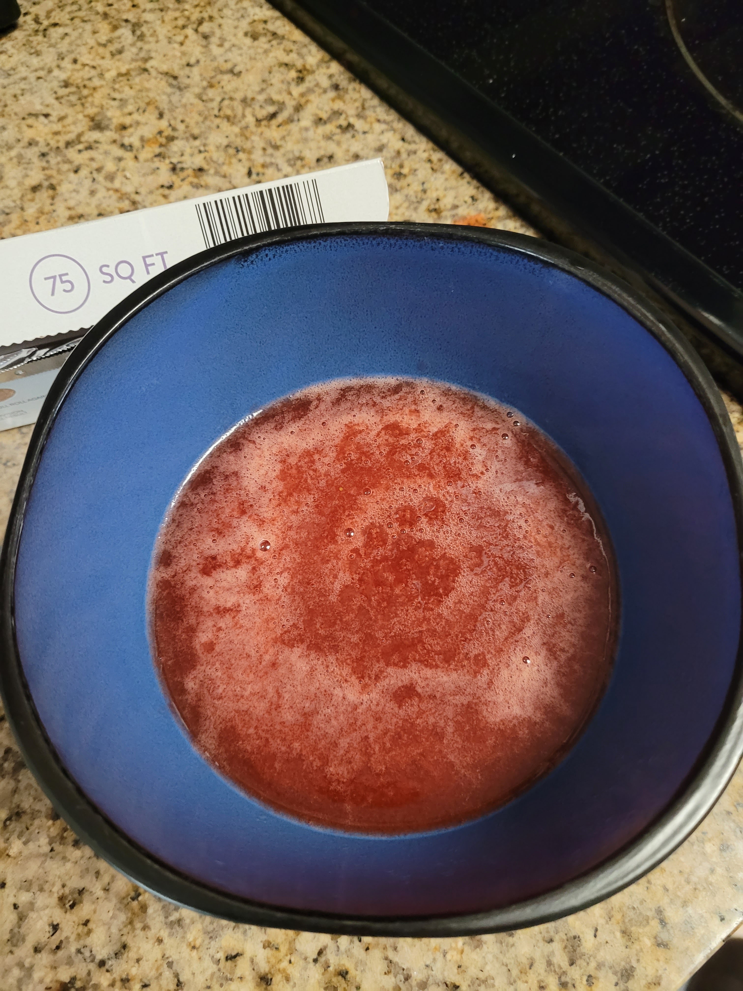 For the final layer, the next day I boiled 2 cups of water and added one 0.6 oz packet of sugar free strawberry Jell-o, mixing for two minutes before removing from heat and letting cool to room temp. You do NOT add the cold water called for on the box. It will set without it, and it would be WAY too much Jell-o with the added cold water. You want a thin layer, not several feet of Jell-o to “tunnel of love” your way through to the cheesecake layers.