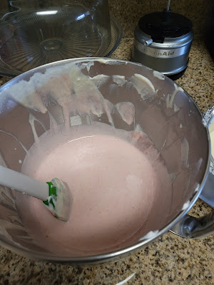 I was multitasking while making my filling. You’ll also need to make a strawberry puree. To do this, I used 2 cups of strawberries, tops removed and then berries chopped in half, mixed with 1/4 cup of monkfruit sweetener in a medium sauce pan. I stirred every few minutes, cooking on medium high, for 10 minutes. By then, the strawberries had broken down, so I used a potato masher to complete the job.