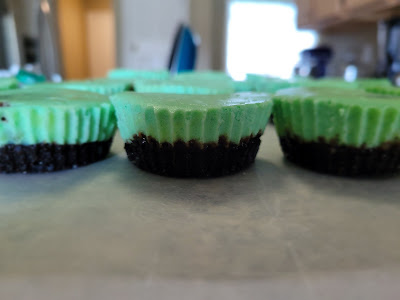 Using a cookie scoop, I dropped a large dollop into each silicone cupcake liner. These liners are awesome, not just because they’re also rainbow colored and therefore St. Patrick’s Day approved, but because you don’t have to spray your pan or use throw away liners; they are so easy to remove ANYTHING from, even sticky foods, so just go get yourself a set. I used the bottom of a shot glass sprayed with Pam to evenly spread the crust out in the liners. A tablespoon would also work! Here’s where I tell you to blind bake these crusts for 5-7 minutes at 325 degrees, then let them cool fully while making your filling. I skipped this step, and the crusts were super soft and messy. Granted, they’re just Oreos and butter, so under baking them poses no health risk, and we’re still eating them by the fistful anyway while my in-laws are here for a visit (also appropriate since they’re the ones who gifted me the silicone cupcake liners).