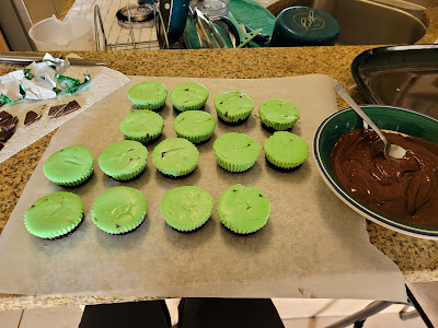 Start by mixing the sweetener and cream cheese together on medium-high in a stand mixer. Give this about 3 minutes to come together and get nice and fluffy. Then add in the extracts, green gel dye, and the egg, mixing on medium-low speed for a minute or two until things are fully incorporated. Mixing on low keeps too much air from entering the batter; this can cause your cheesecakes to crack. It’s not the end of the world if these do since they’ll be topped with ganache. Finish by mixing in the Andes baking chips on low speed. Pour the batter on top of the cooled crusts, filling each liner almost to the top. Bake for 20 minutes at 325 degrees, then turn off the oven, crack the door open, and leave them to finish baking for another 10 minutes.