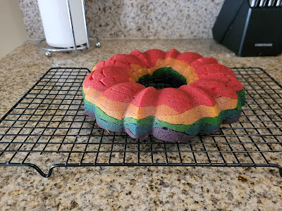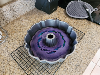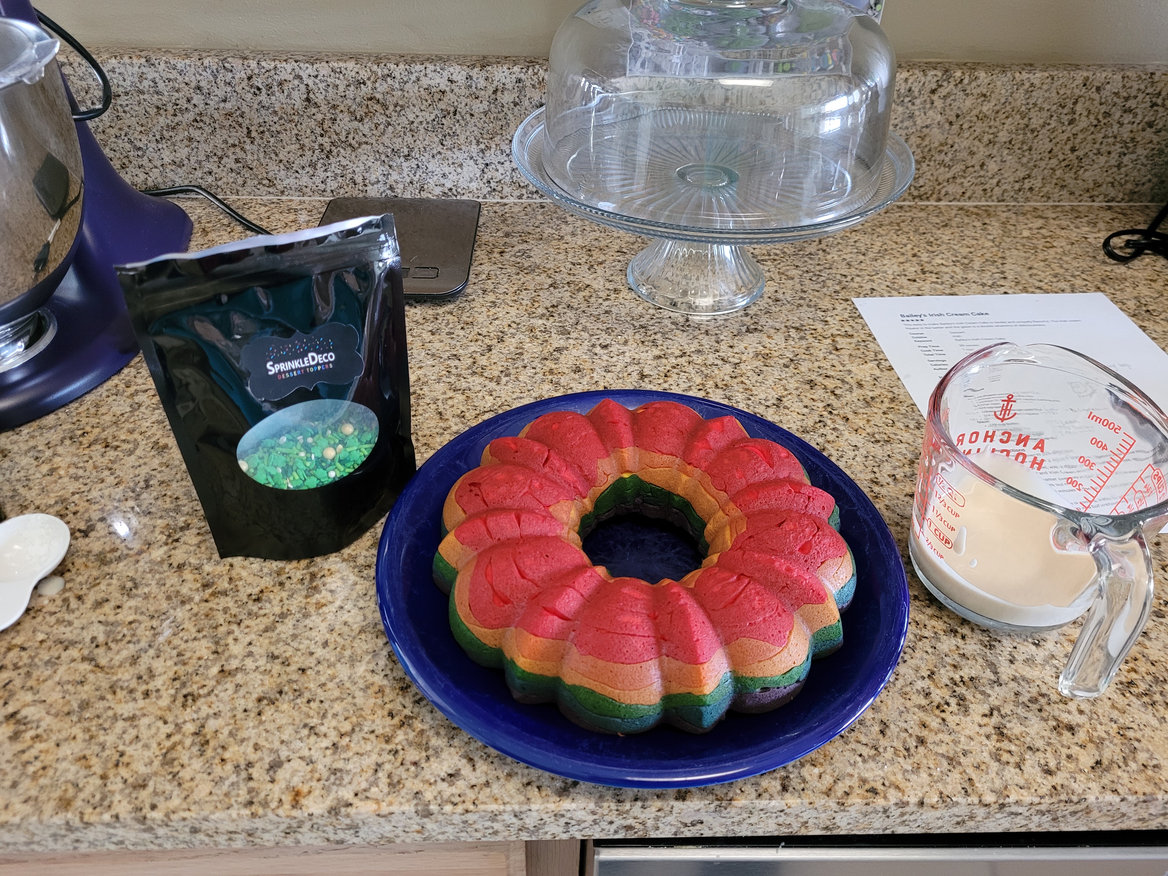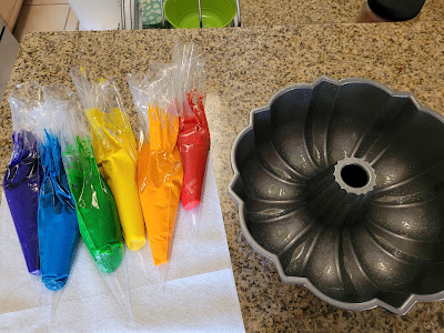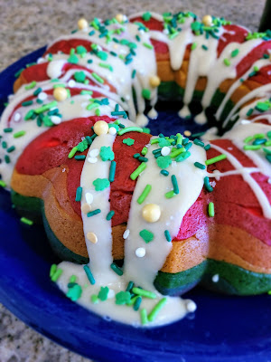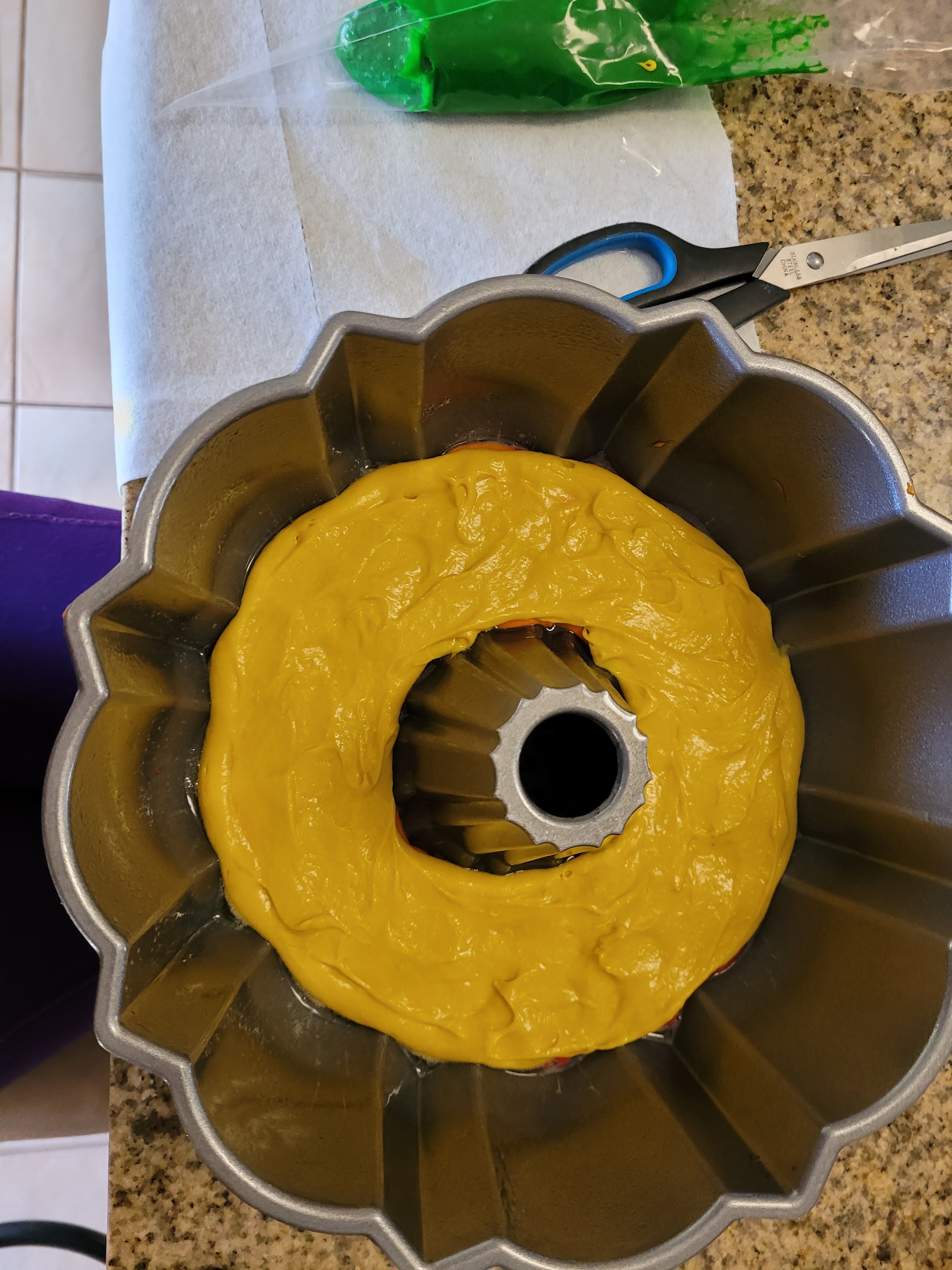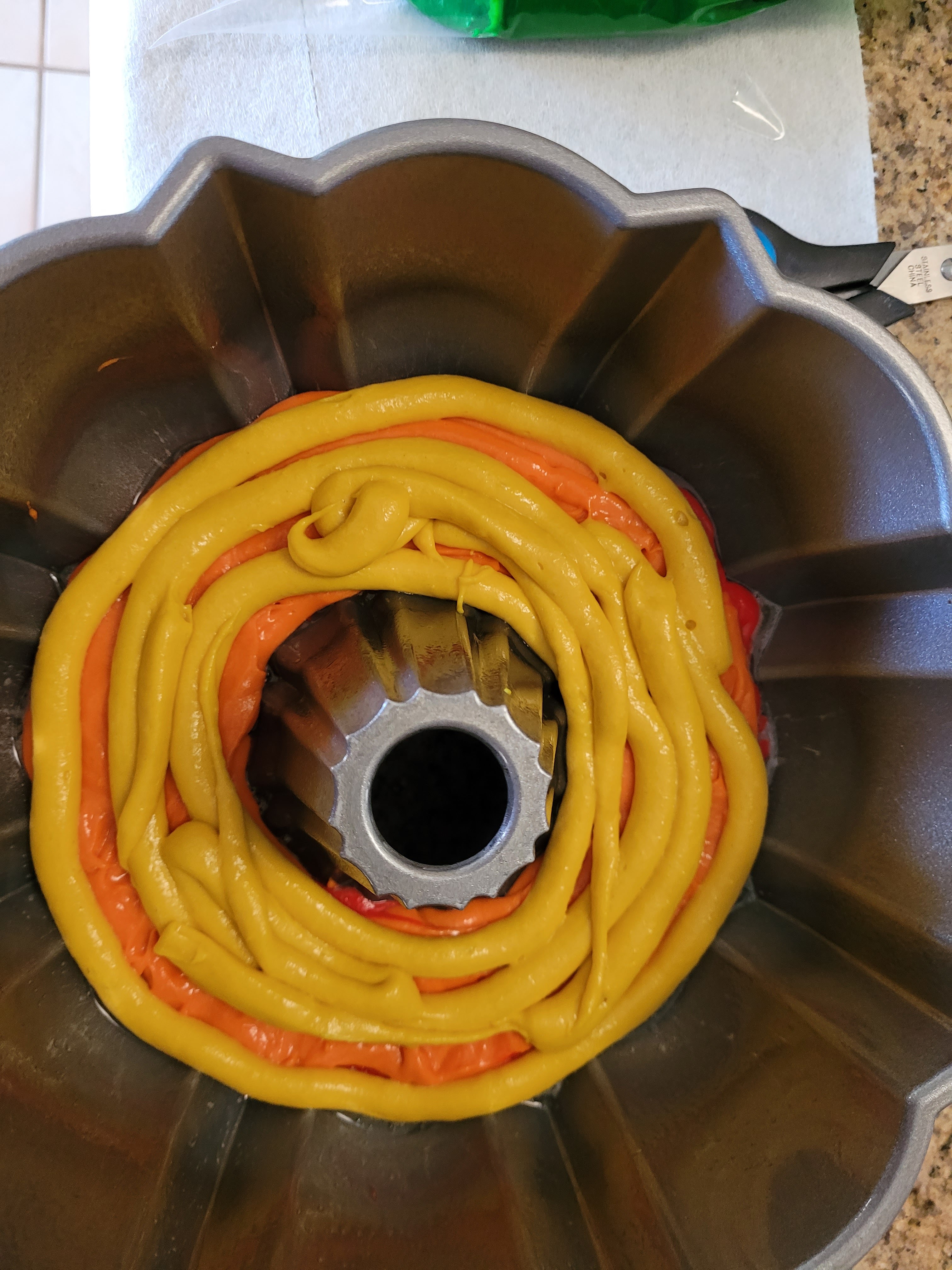 Start by preheating your oven to 350 and grease a bundt cake pan very well. In a bowl, whisk the eggs, vanilla, milk, and Baileys, and set aside. In your stand mixer, blend the applesauce and butter together (skip this step if not adding butter, just dump the applesauce in your mixer bowl). Add the pudding mix and 1/3 of the cake mix to the stand mixer, blending on low until it begins to combine with the applesauce/butter. You can scrape the bowl as you go, and add in 1/3 of the liquid mix. Blend, add 1/3 more dry mix, scrape the bowl, add 1/3 more liquid, etc. until everything is in the bowl, mixed together on low speed. Try not to over mix since you have to dye your batter and mix it around more later.