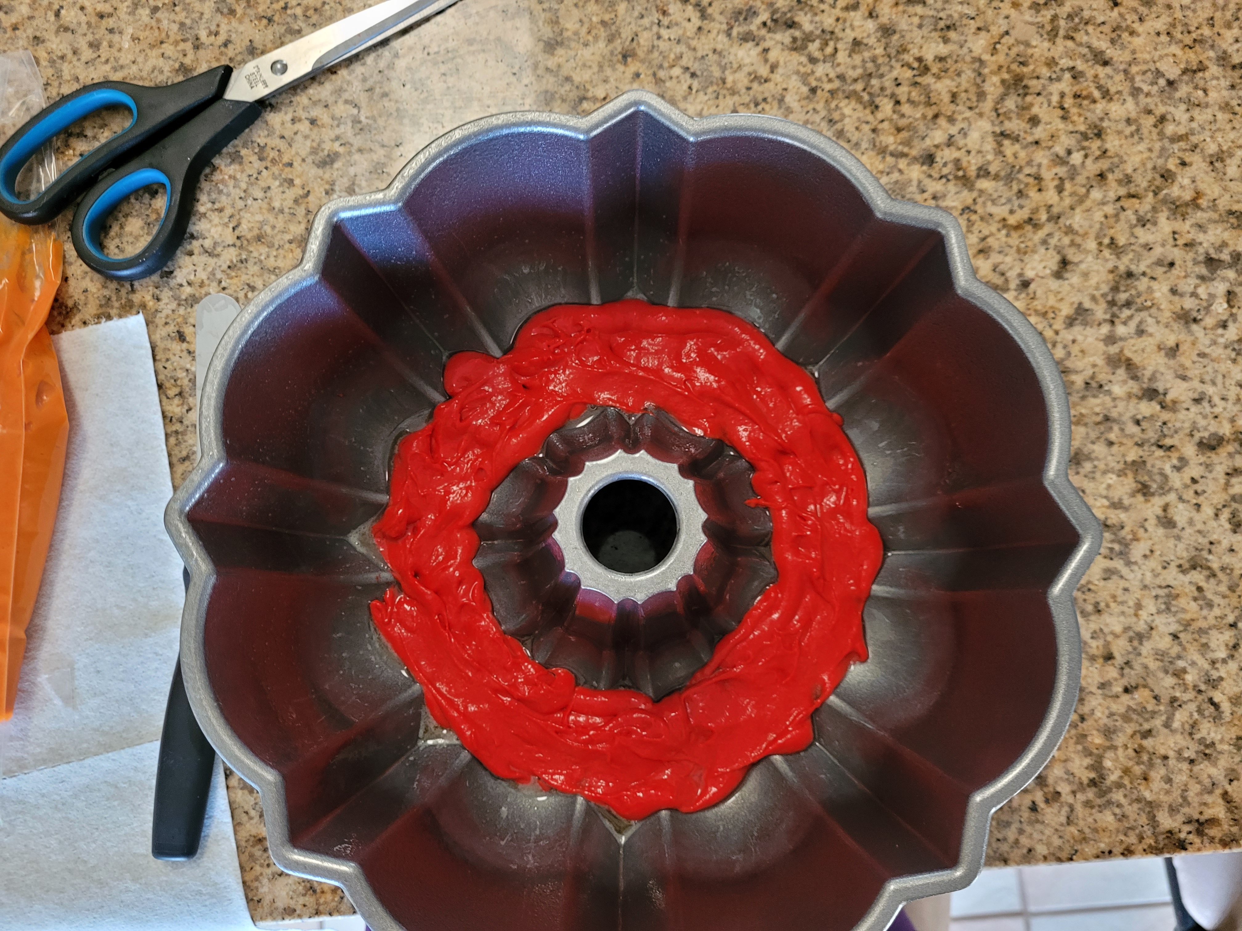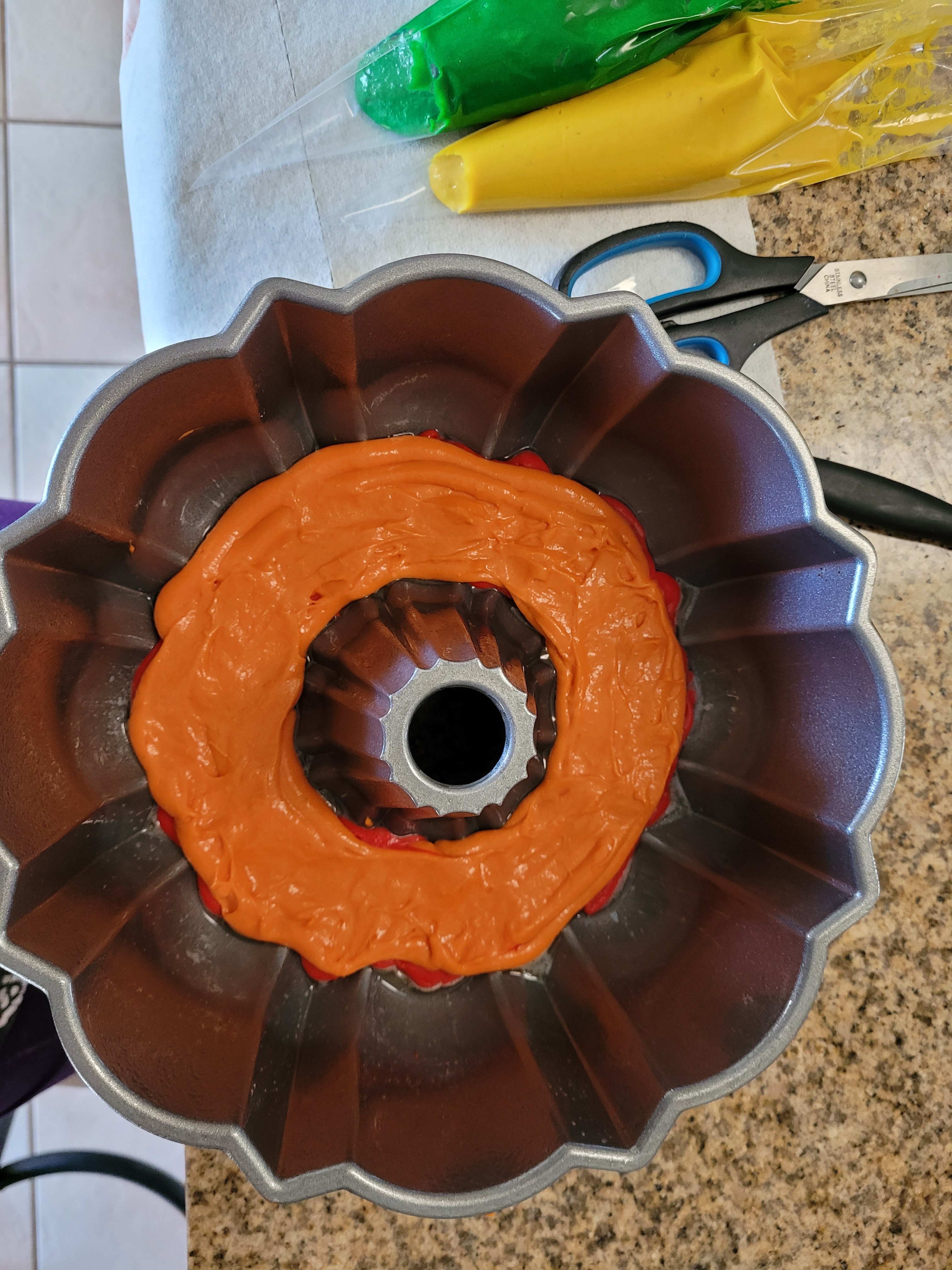 Start with your red, and pipe circles into the bundt pan. Smooth these out with your spatula.