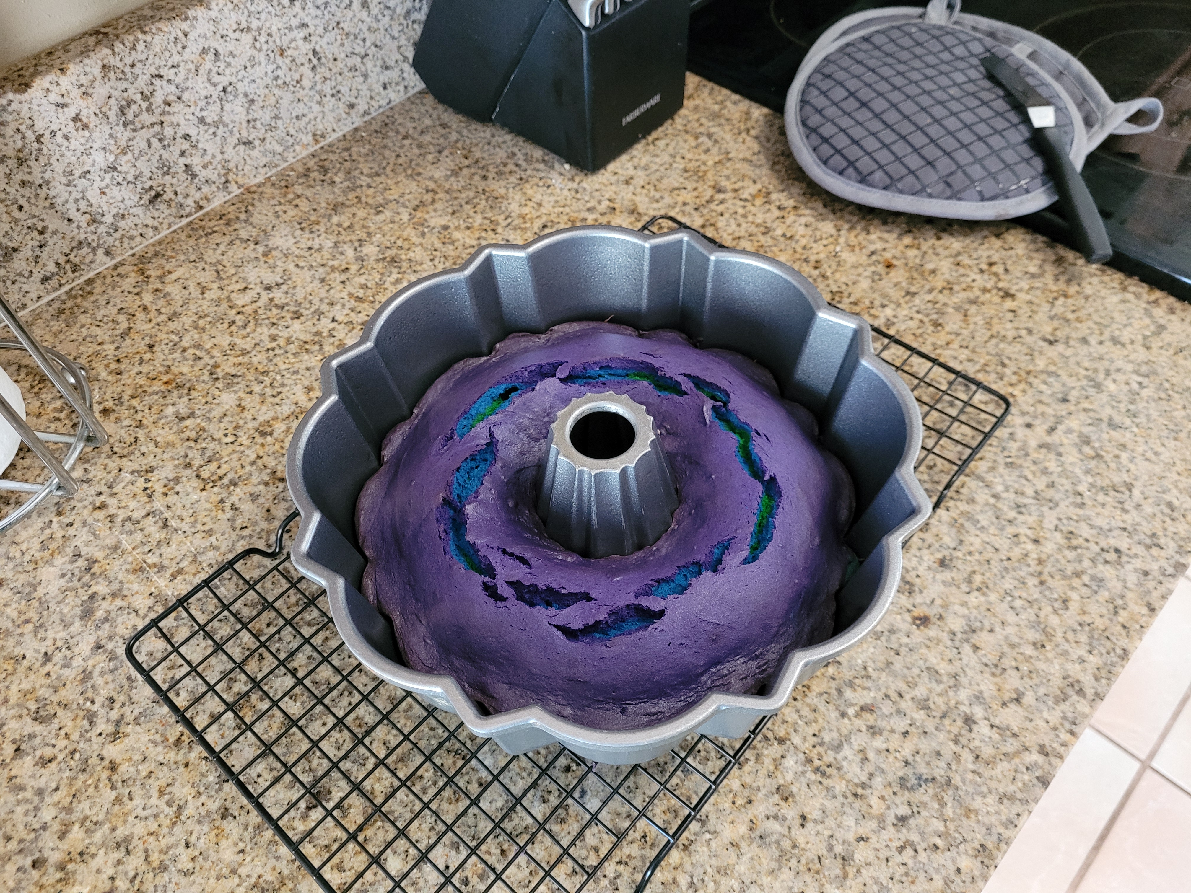 Repeat with the green, blue, and finish with the purple. Give your pan a few gentle taps on the counter to get rid of any bubbles, but not so hard your layers start to mix together. Bake this at 350 degrees for 30-35 minutes. A toothpick should come out cleanly when it’s done.
