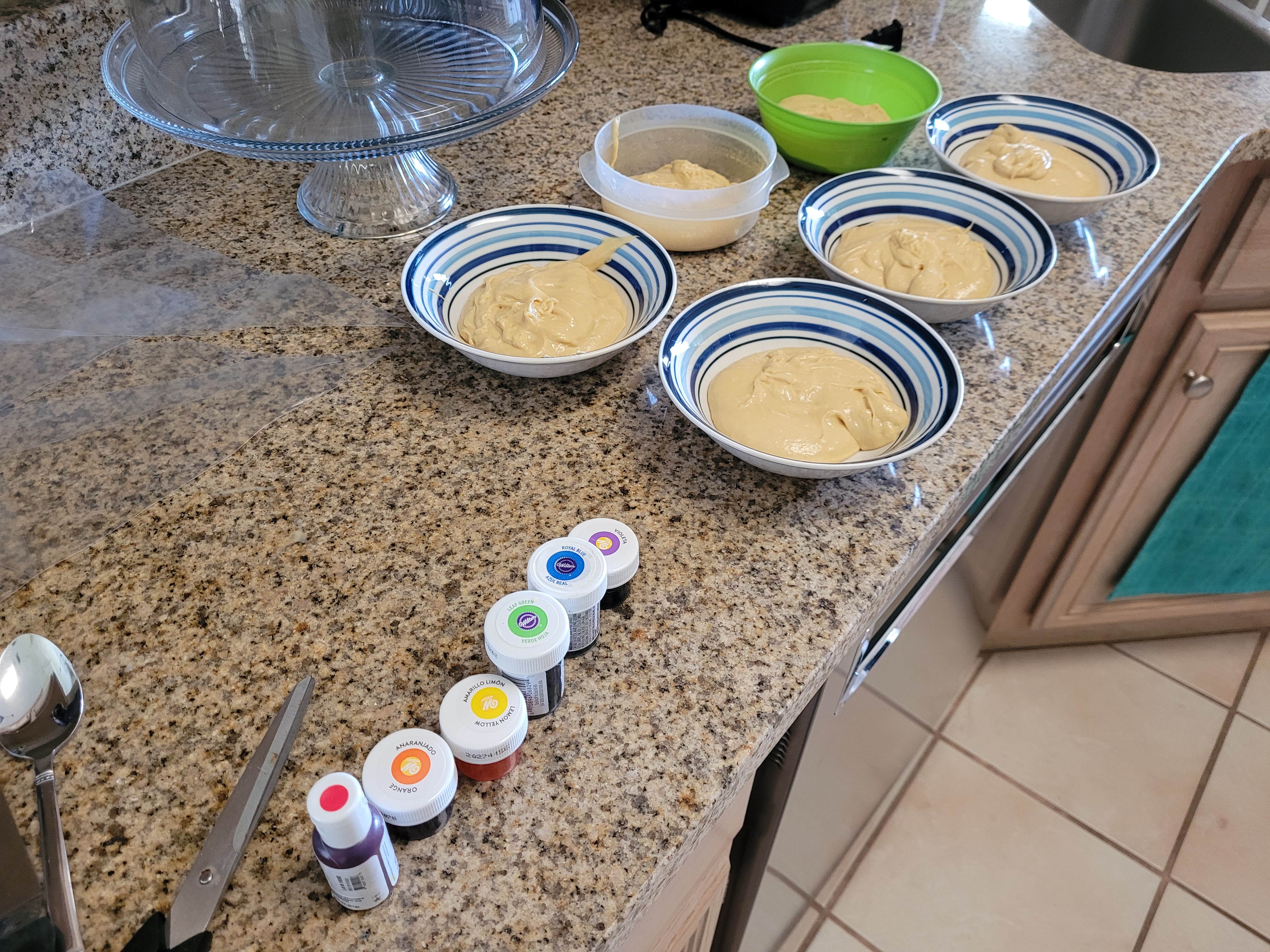 You’ll need every bowl you have in your house and potentially even your neighbor’s, but, worth it, I promise. A technicolor dreamcoat of a cake requires a little extra effort. Split your batter evenly into 6 bowls. With my gluten free cake mix (which is a little less than a typical cake mix), I was able to scoop 2/3 cup into each bowl.
