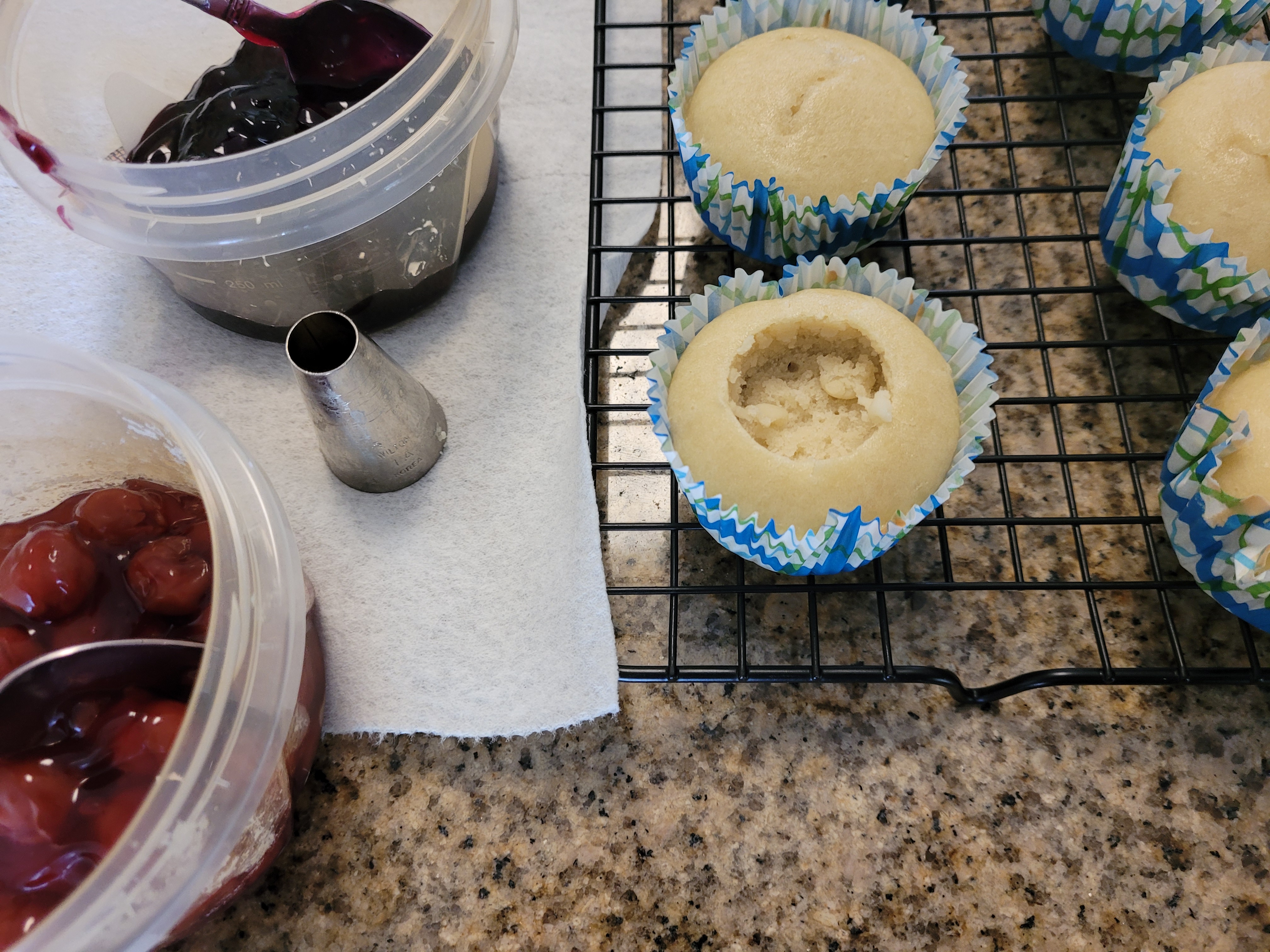 Simply wiggle the base of the frosting tip into the center of the cupcake until it’s about halfway into the cake. Remove, and grab some pie filling.
