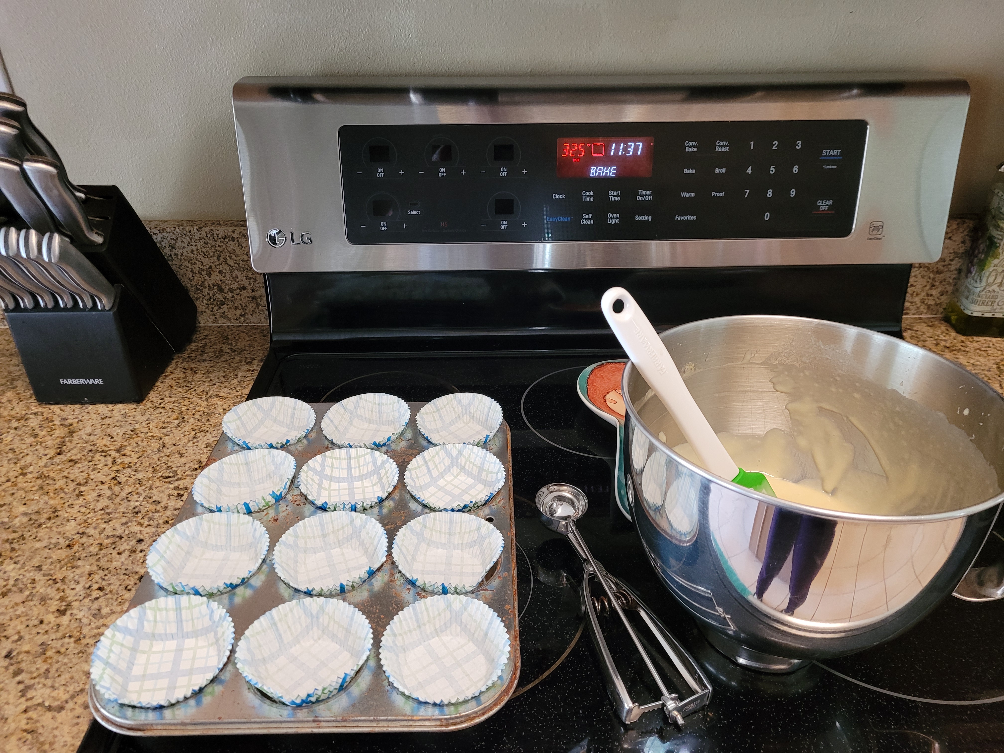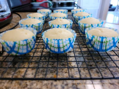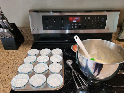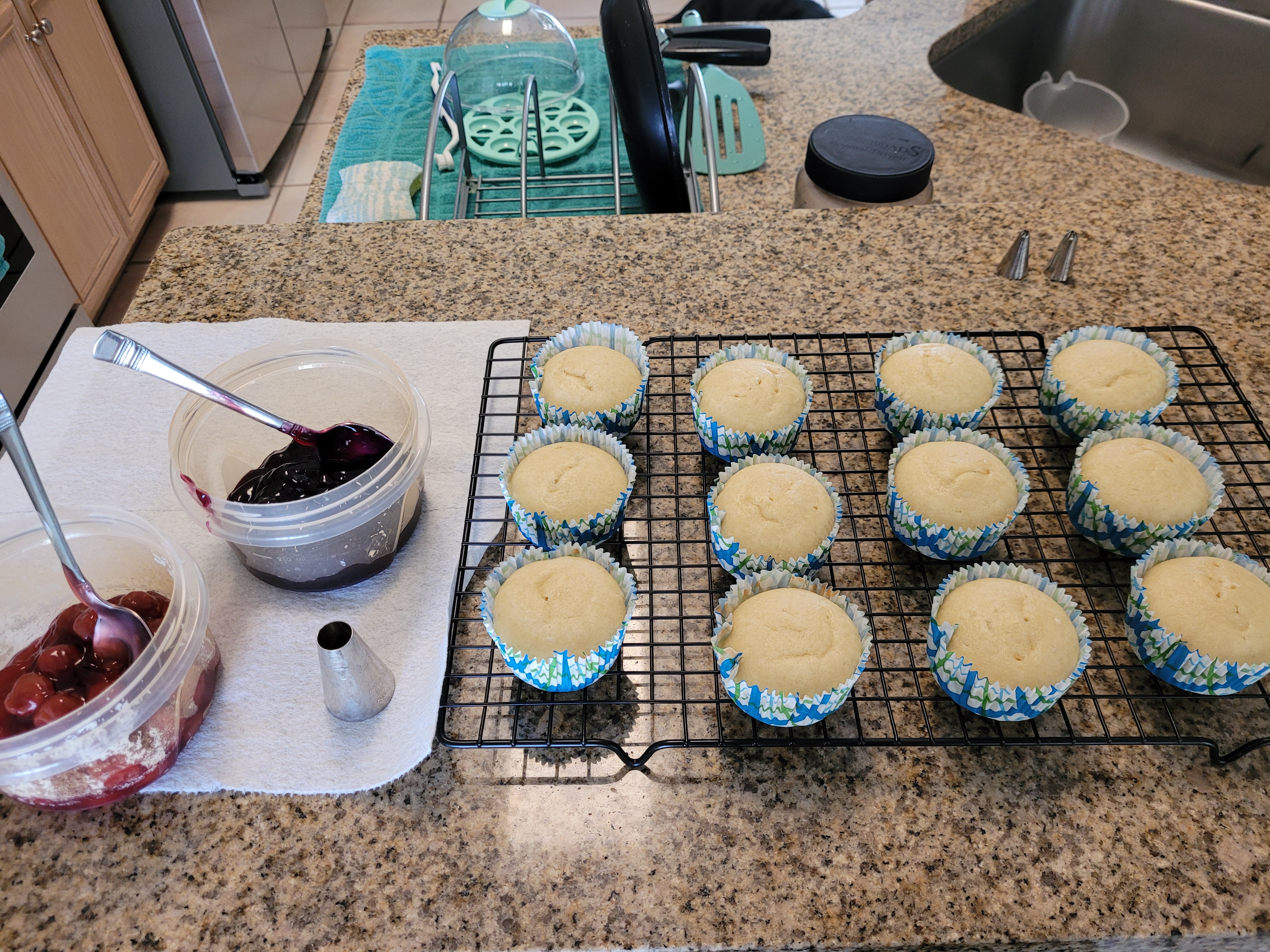 I preheated the oven to 325 (my oven cooks HOT and things get dried out easily; the box instructions called for 350, so follow your instructions if your oven isn’t tethered to the sun), lined my muffin tin, and then dumped everything EXCEPT the pie fillings into my stand mixer, mixing on low for 30 seconds, then bumping to medium-high for two minutes. I used a cookie scoop to place one and a half scoops of batter into each liner, and I baked these for 21 minutes at 325. A toothpick came out mostly clean, and I didn’t want to risk over-baking and drying out the cakes, so I removed them from the oven and let them rest while still in the pan on top of a cooling rack for 10 minutes before removing from the pan and allowing to cool completely to room temp.