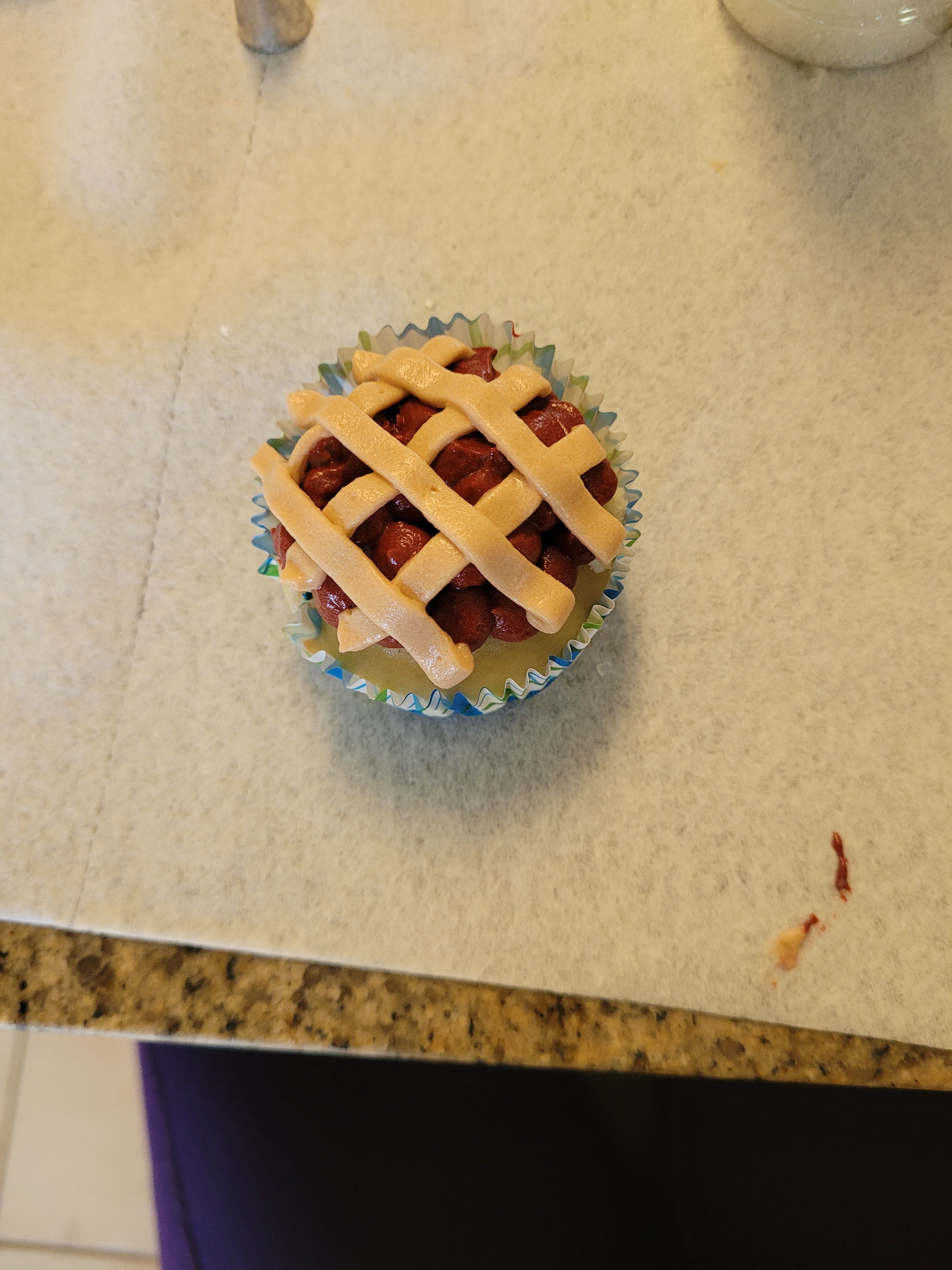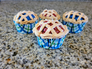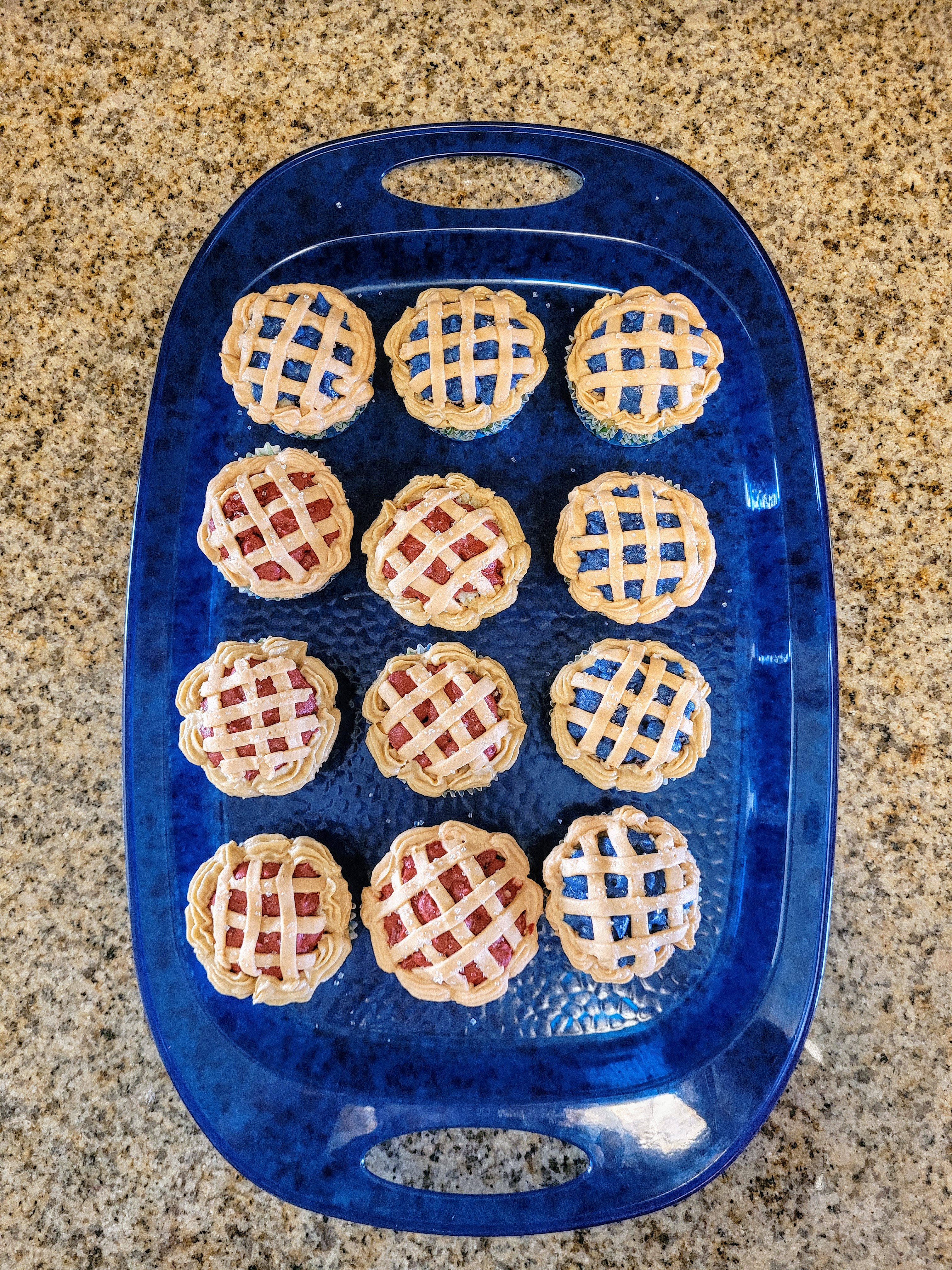 Then I turned my cupcake the opposite direction and piped three more lines to finish my lattice pattern, then back into the fridge with all six cherry cupcakes, and out with all six blueberry cupcakes to do the same thing. My sweaty hands (why is everything so hot, Florida?!) were an issue a few times, so I also placed my piping bag (tip removed) in the freezer for 5 minutes or so to let my frosting firm back up. If you find your frosting is getting hard to control, try freezing it for just a bit. This will make a huge difference in how crisp your lines look.