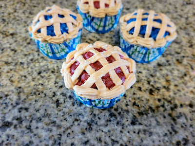To start decorating your pies, simply pipe little round blobs of cherries or blueberries on top of your filling with a small round tip. I did all my cherry pies first, then put these into the fridge so the frosting would firm up while I piped all my blueberries. I shifted back and forth between having one set in the fridge to firm up the frosting while the other set were out being decorated since I live in Florida where it is hot and humid and things as delicate as cream cheese frosting stand no chance at room temp.