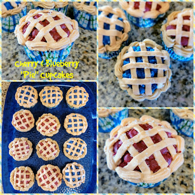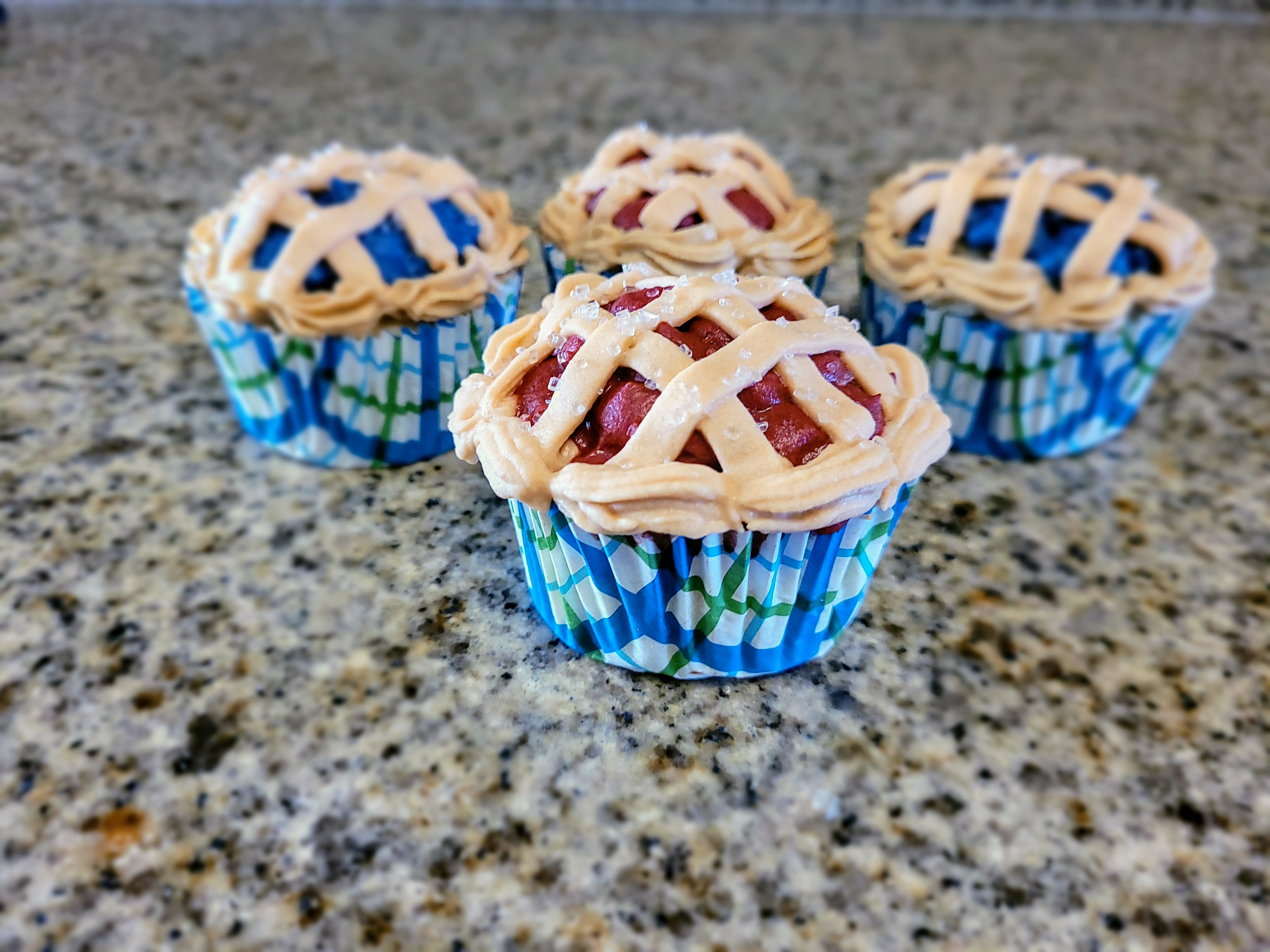 Okay, these aren’t actual pies, but hear me out…Pies are baked goods that are filled with fruit and have a crust. My pie cupcakes are also baked goods that are filled with fruit and have a crust (sure it’s a piped decoration crust, but it still counts). Other added benefits of pie cupcakes over actual pies are that shoveling them in your mouth using only your hands is not frowned upon, you get 12 servings instead of only 8, and for the life of me, I cannot get a gluten-free scratch pie crust recipe to work, but cupcakes? Oh yes, I can make the heck out of some cupcakes. If you’re pie-ning for a dessert that is a cute, festive addition to any summer BBQ (now that we can do those again, yay, science!), these more than fit the bill. Half a dozen cupcakes are heaped with blueberry pie filling and the other half have cherry pie filling inside. You could easily double the recipe for 24 cupcakes, but my husband and I don’t need 24 cupcakes for just the two of us (read: I take that as a personal challenge to eat them three at a time). Thankfully, this recipe is only 195 calories per piecake…which means you could also top them with the world’s tiniest scoop of ice cream and have guilt-free pie a la mode!