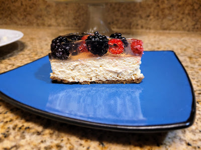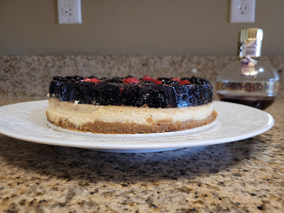 You can play around with the liquids here. Next time I’d use more booze, maybe 50:50 tonic to liqueur. It does “bake out” some when you boil it, so the flavor is more mellow. Start by placing 1/2 cup of the tonic in a large bowl and sprinkle a packet of gelatin on top. Let this rest for 5 minutes while you bring your remaining 1/4 cup tonic, 1/4 cup Chambord, and 1 cup of water to a boil in a medium saucepan. Once boiling, add the sugar and whisk until dissolved. Now, carefully pour this on top of the bowl with the gelatin. Whisk until no lumps remain, then pour into an 8×8 pan and place in the fridge to start to set. Give this a stir every 10 minutes or so. Once it starts to thicken, it’ll be ready to pour on top of your cheesecake. It took 35-40 minutes for me. I pulled out of the fridge at 40, and it was starting to get clumpy and a little difficult to work with. I wish I had pulled it out at 35 minutes, so keep a close eye on it while you layer your cheesecake with fruit.