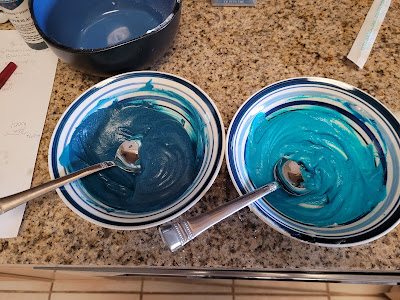 In two bowls, place a heaping amount of plain white frosting. Dye one light blue, and then in the other, mix blue and navy blue gel dyes to achieve a rich, dark blue hue. Now, grab your cake!