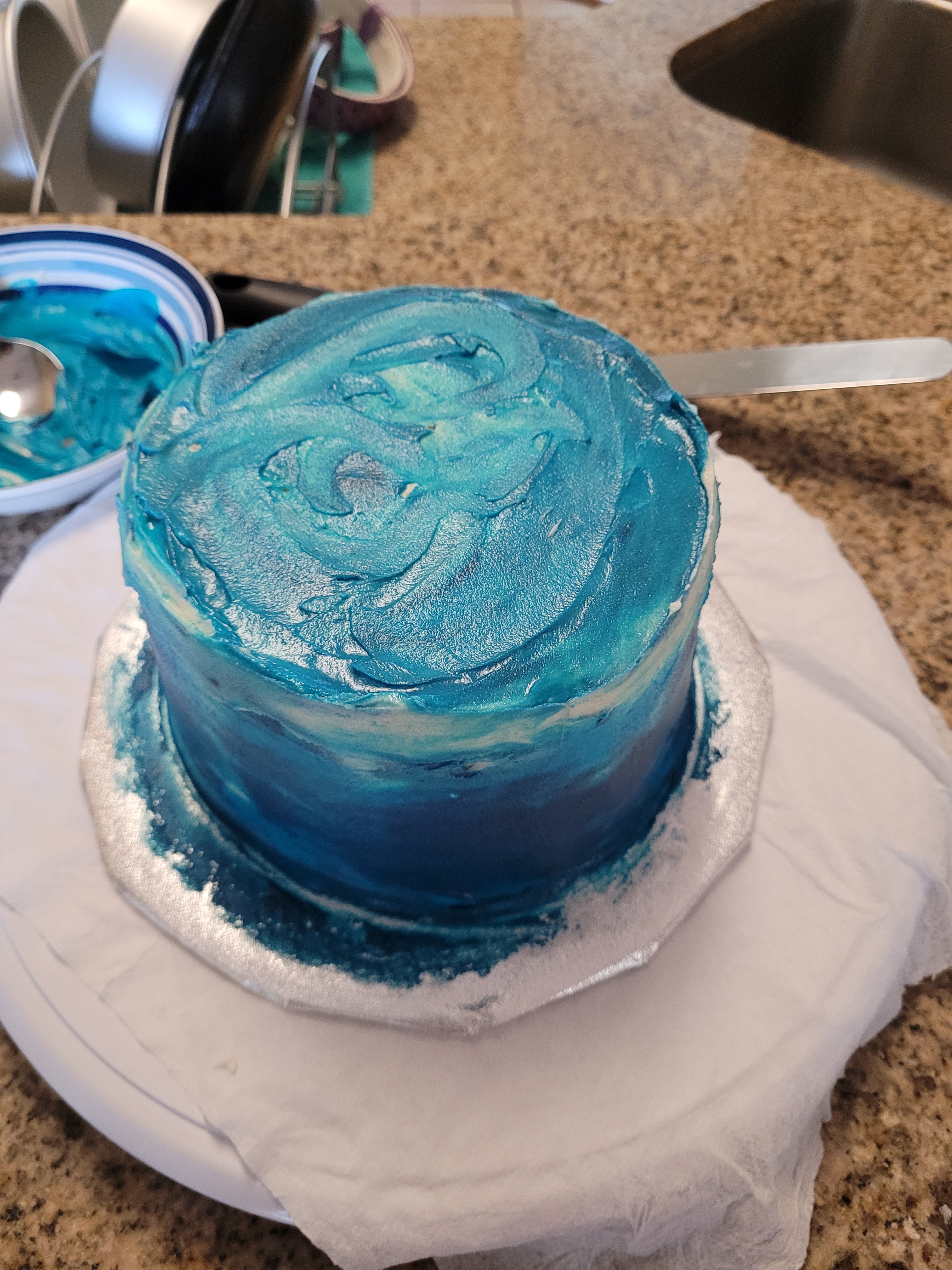 Itching intensifies. Okay, okay, with a small angled spatula, just plop drops of light blue and dark blue frosting all over the place. There’s absolutely no rhyme or reason here, you just want a sort of even balance. Once you’ve done that, you just need to come back in with an angled spatula or scraper, and gently scrape the sides of the cake until your colors are blending together. I would make a pass around the whole cake, clean off my scraper, and make another pass. I did this 3 times and followed the same suit on top.