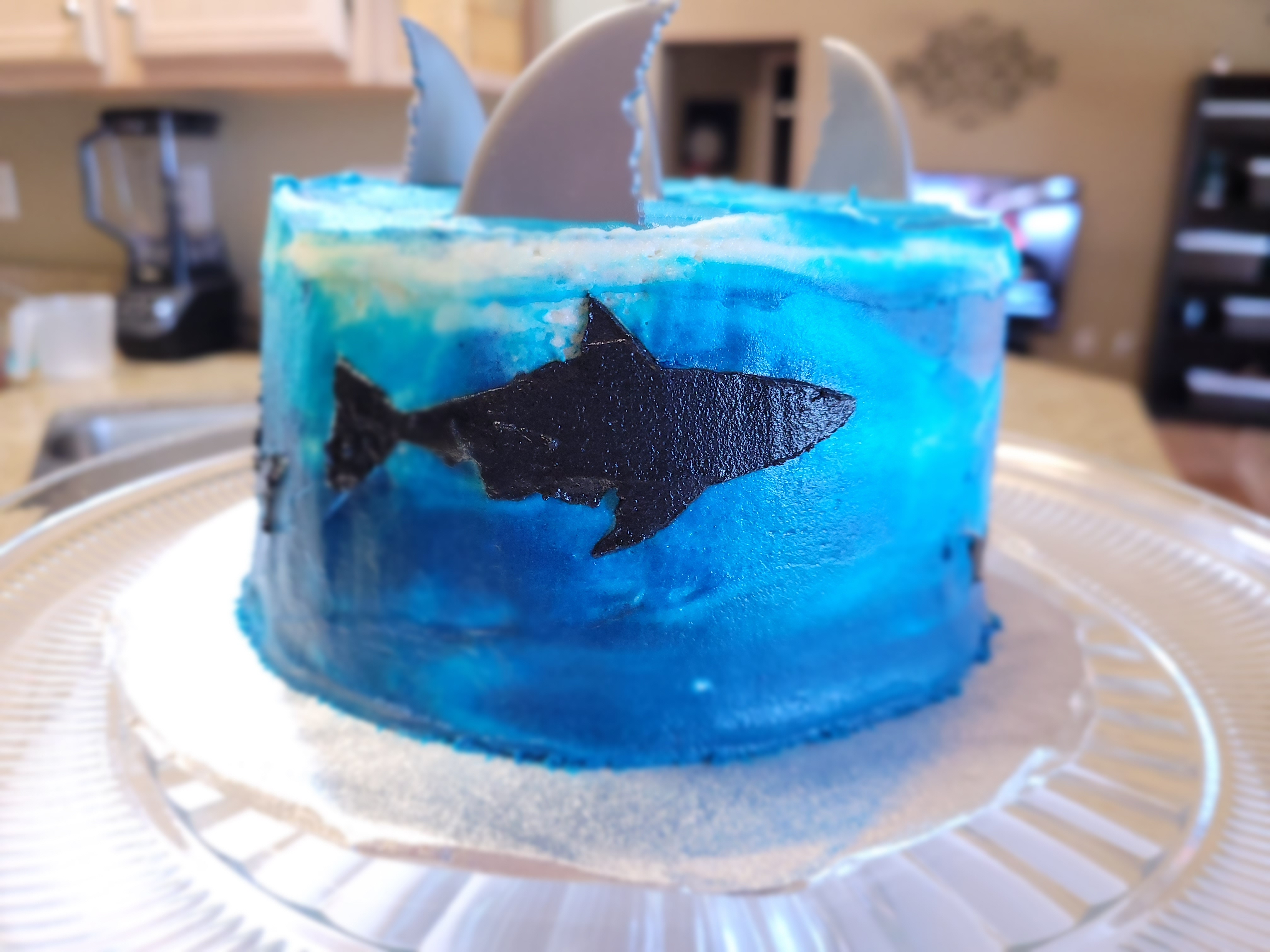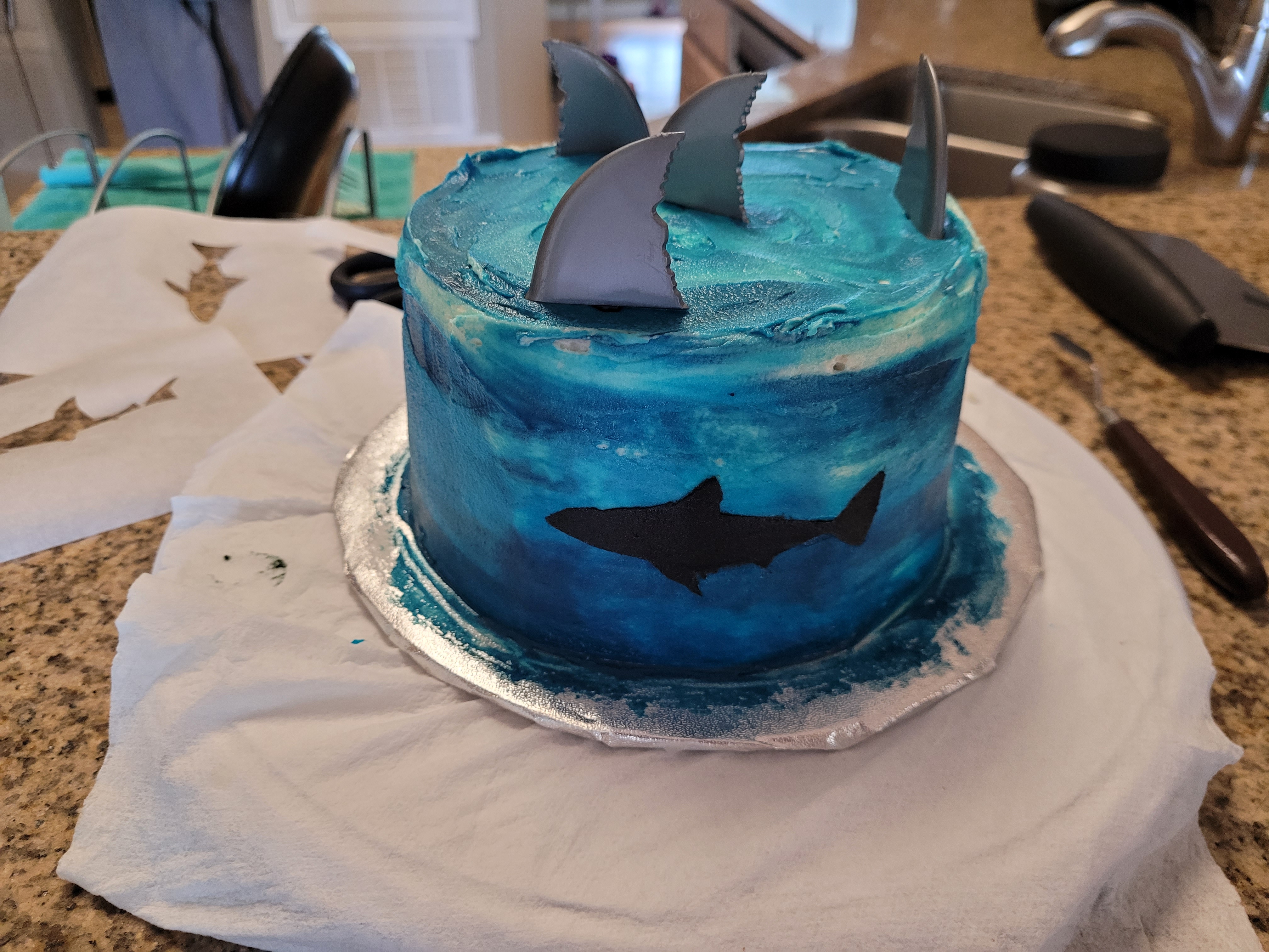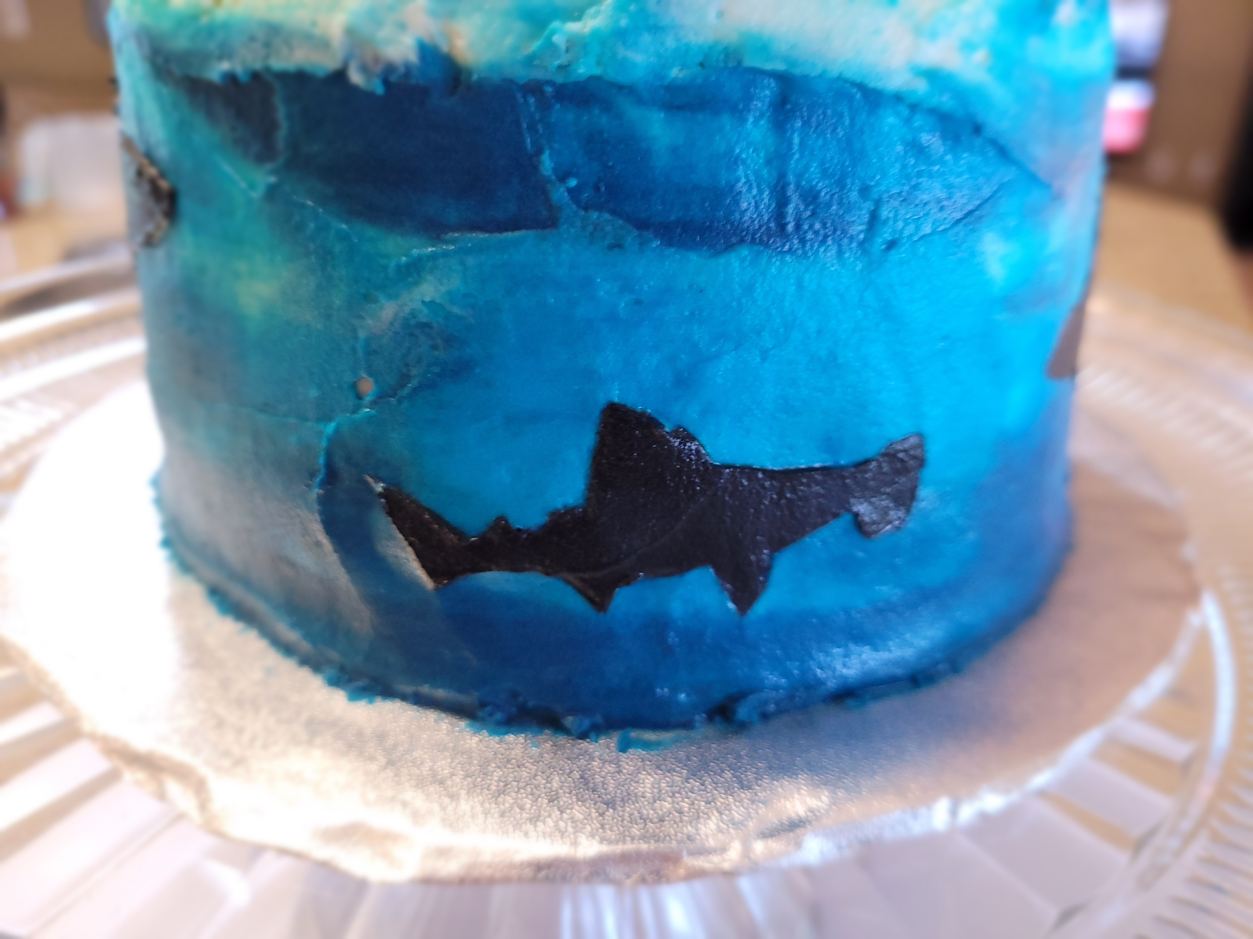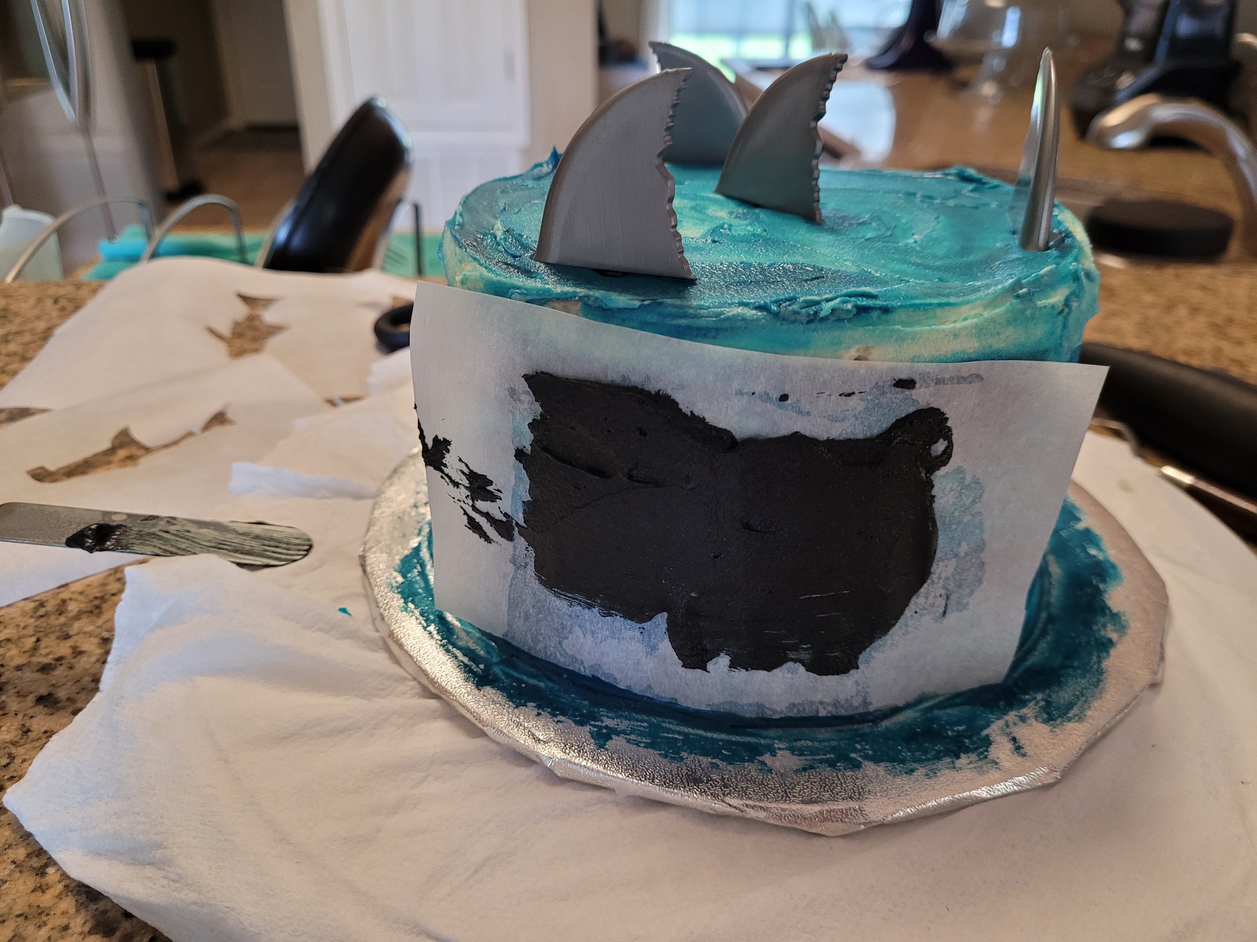 I was afraid I’d miss a spot and the whole stencil was gonna look more like a blob fish than a shark. But, I took a decent amount of black frosting and spread it evenly over my stencil. I used my scraper to make one pass over the whole stencil, then, whilst holding my breath, very gently peeled the stencil off the side of the cake.