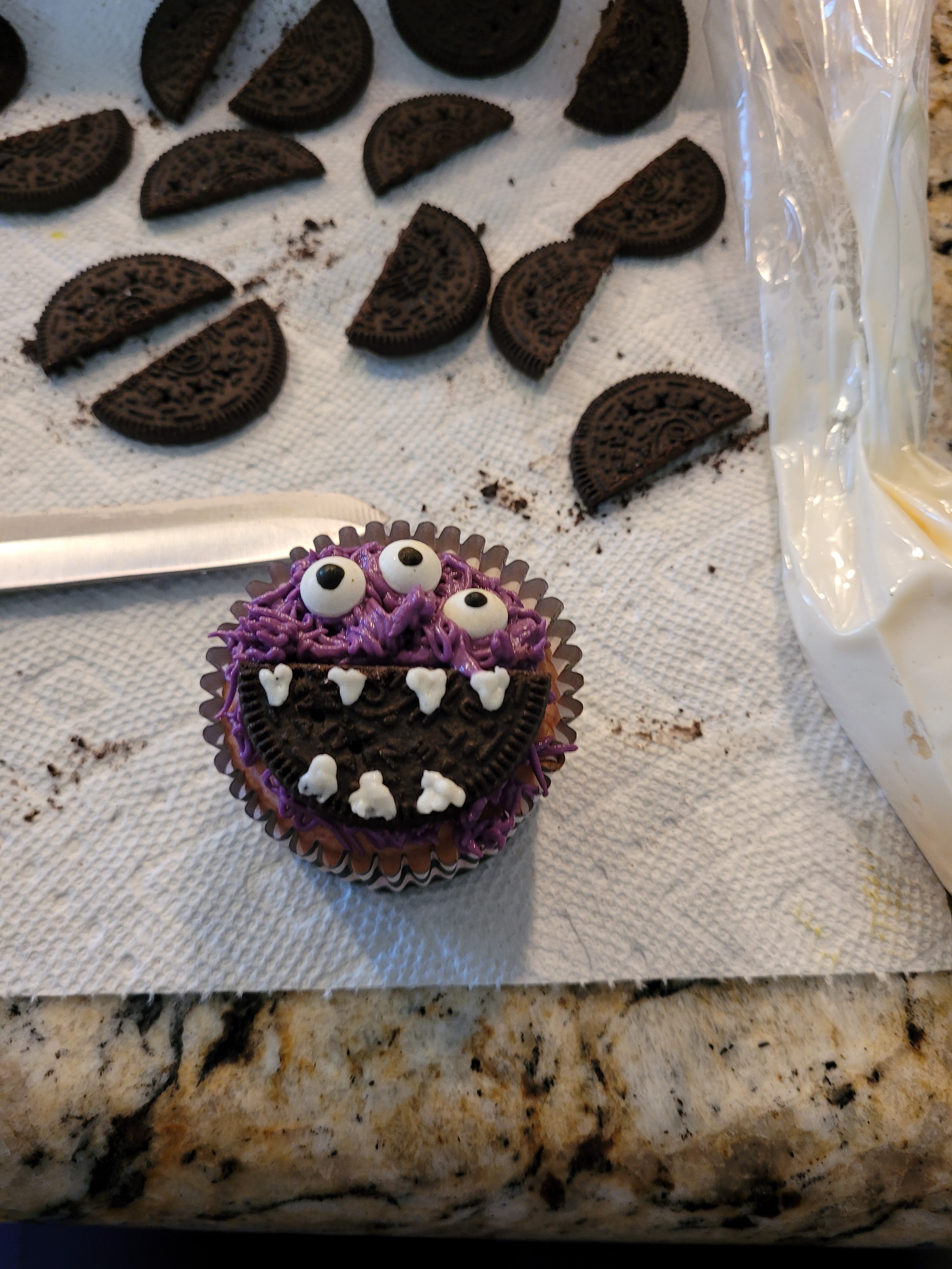 I used orange, bright blue, bright purple, and lime green dyes for my monsters. I also kept a portion of frosting plain white for monster fangs. Other things you’ll need include Oreo’s for mouths, eyeball sprinkles (what do you mean you don’t have these on hand already? What are you? Normal?!), various piping tips (open star, three star, basket weave, grass tip for hair, etc.). I pretty much used every tip I have to make random monsters. Remember, they’re monsters, not models, we don’t expect perfection, we expect scarefection.