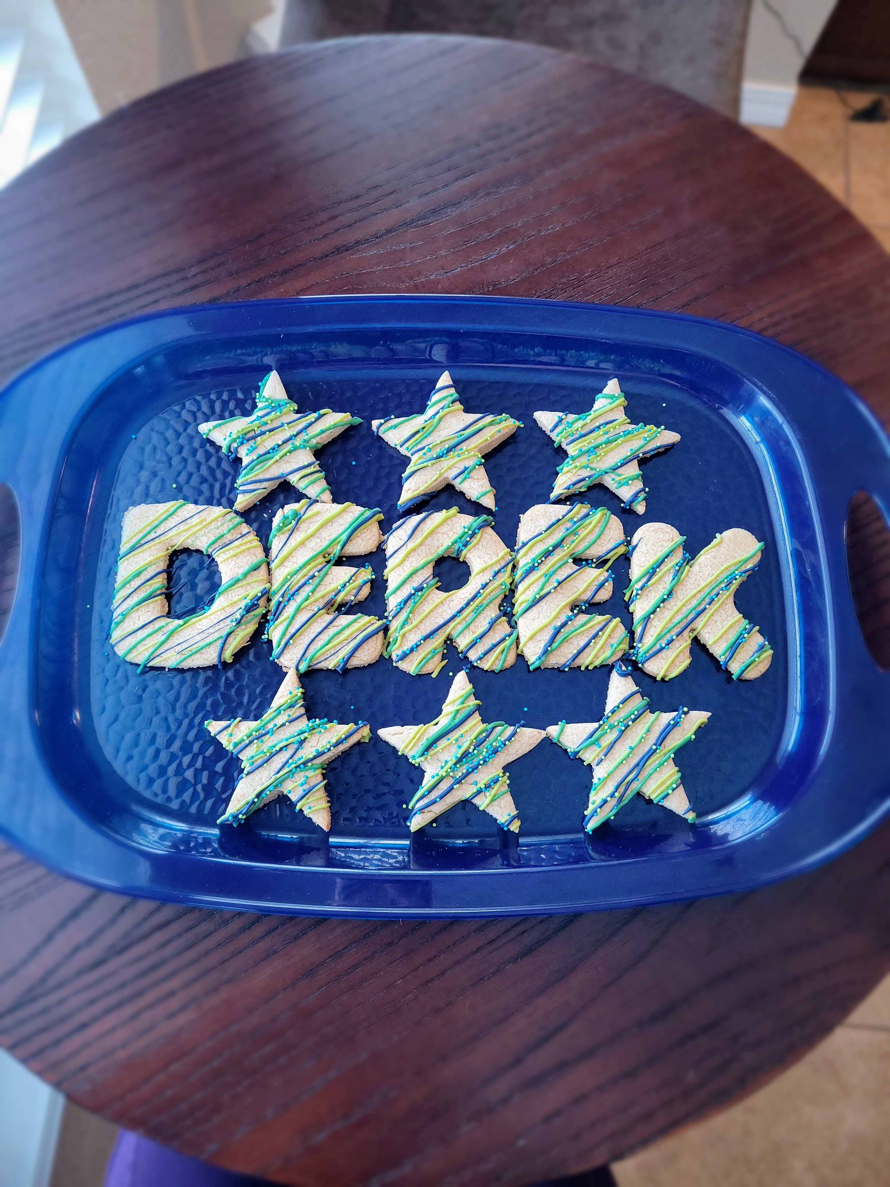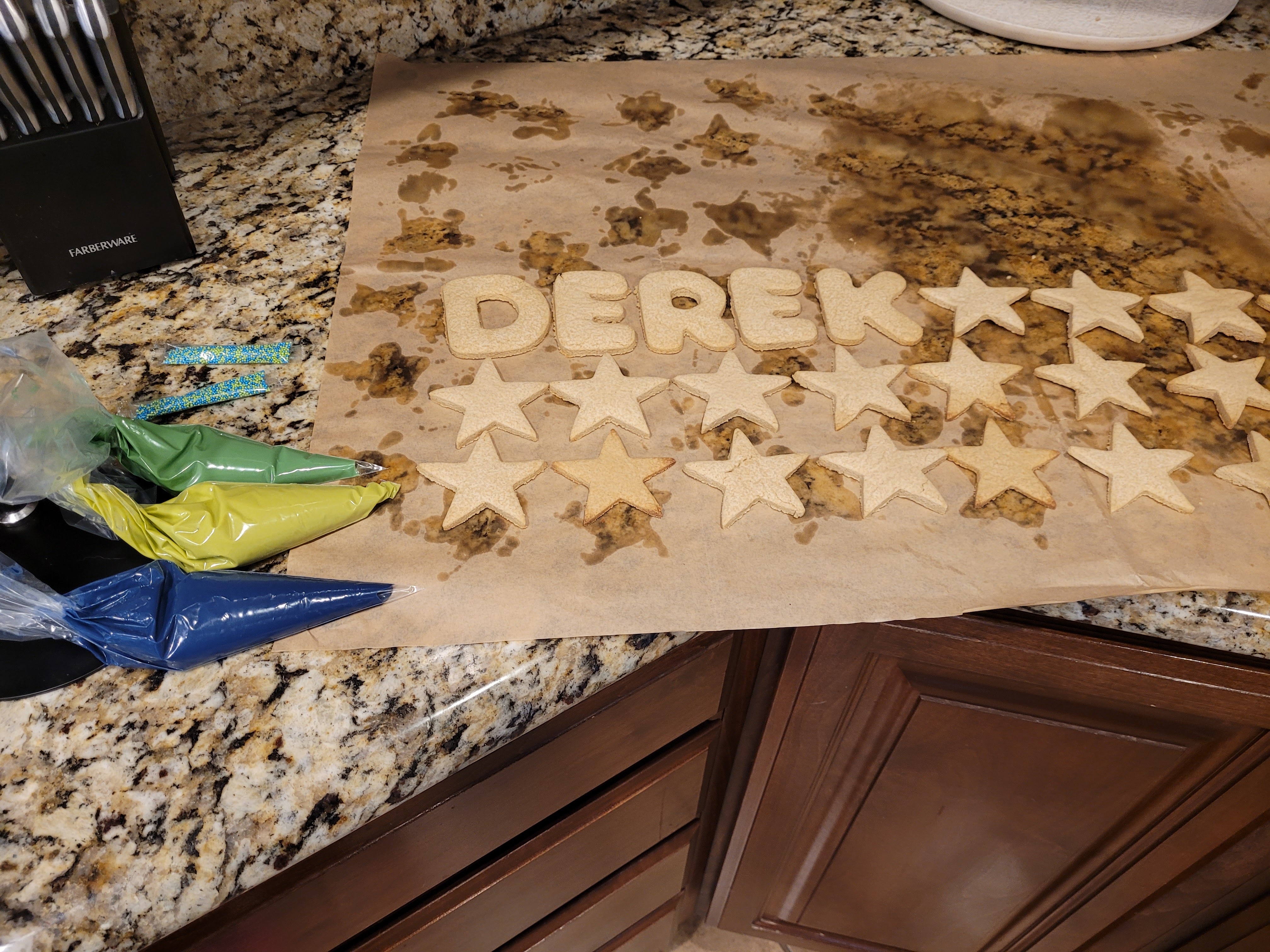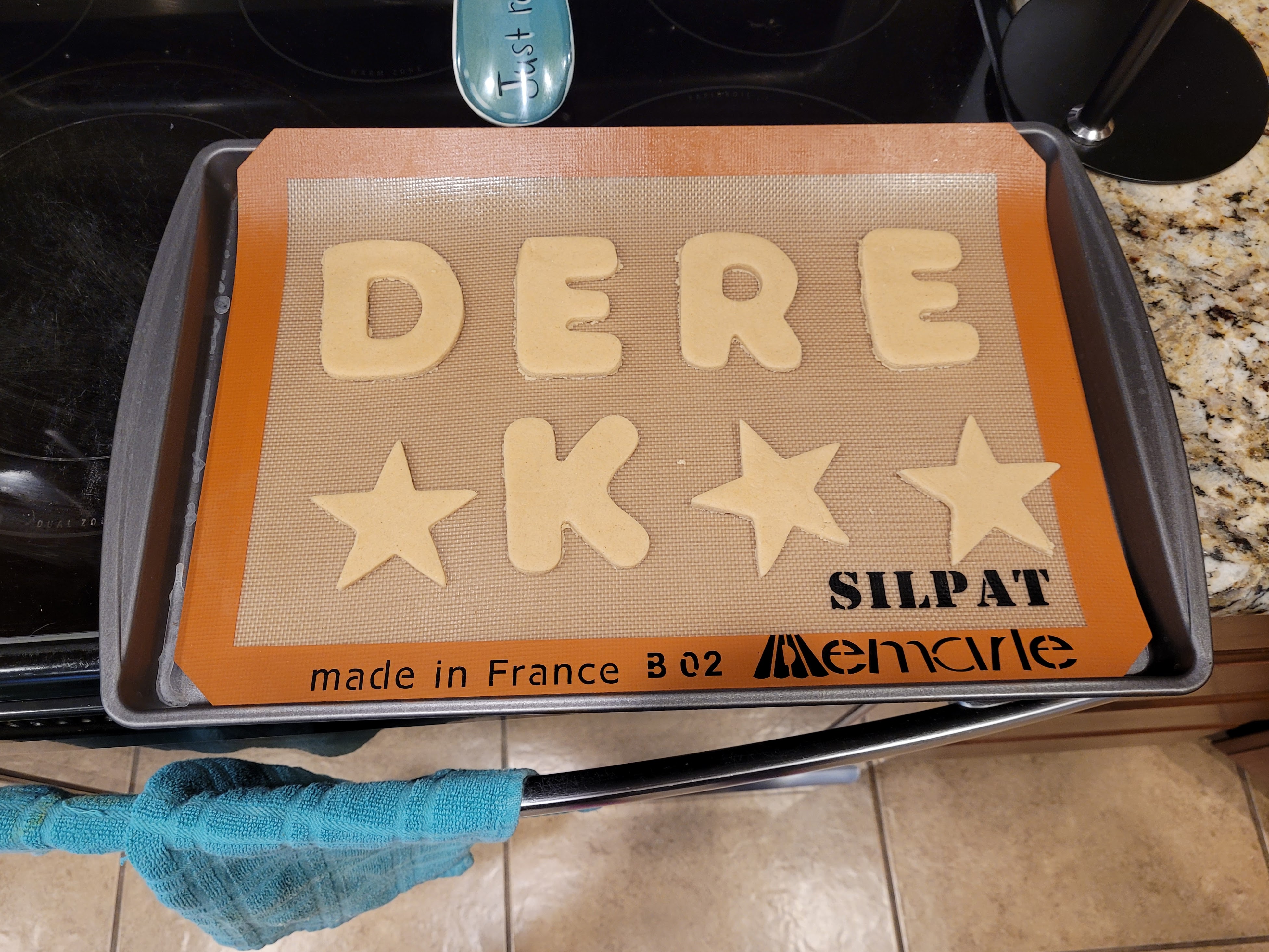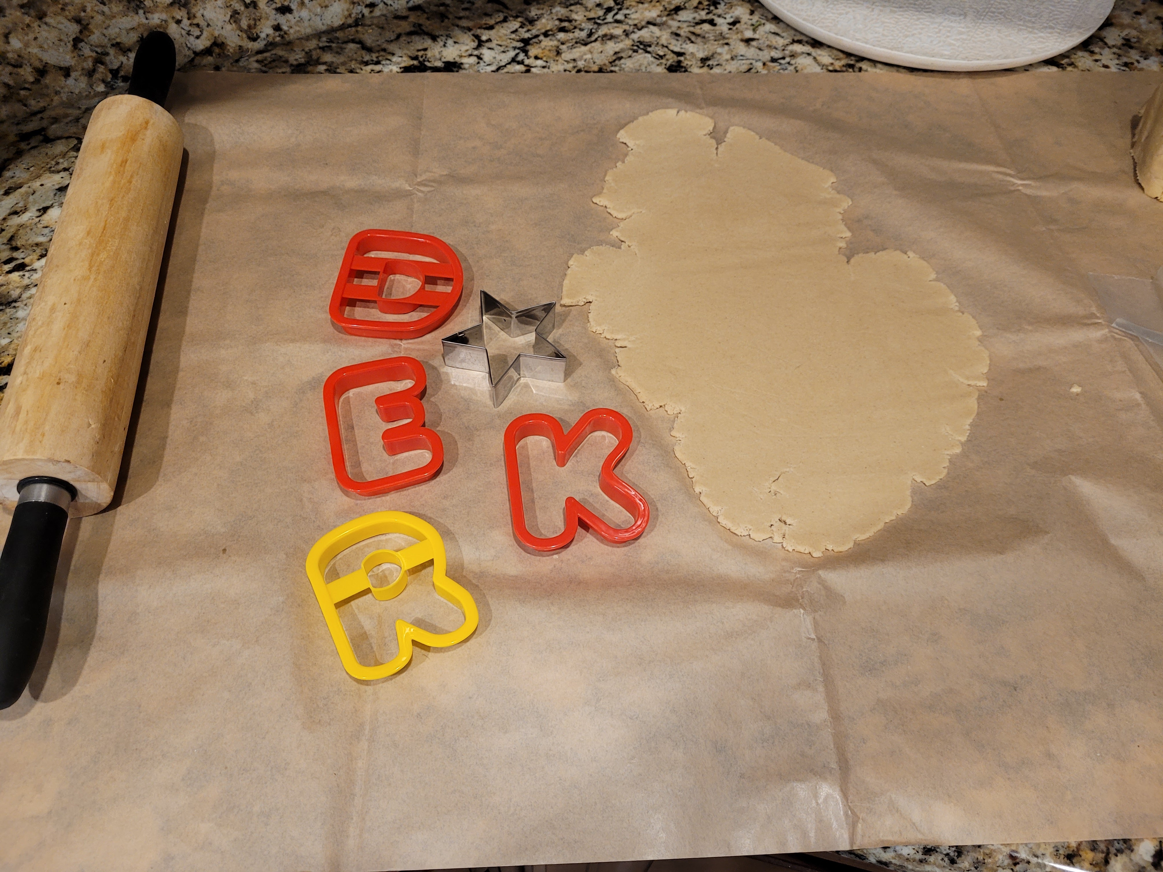 I wanted to make my husband’s name and then a bunch of stars for the rest of the cookies, so I gathered up some cookie cutters. Any shape will work with these. I took half of my dough ball and rolled it flat with my rolling pin. You can flour your pin or use plastic wrap on top of the dough (my preferred method) to get these to about a 1/4″ thickness. You will be rolling a lot, so maybe do some shoulder stretching first. Then cut out with the shapes of your liking. You can reshape the leftover pieces into a new ball of dough and repeat until you’ve used everything up.