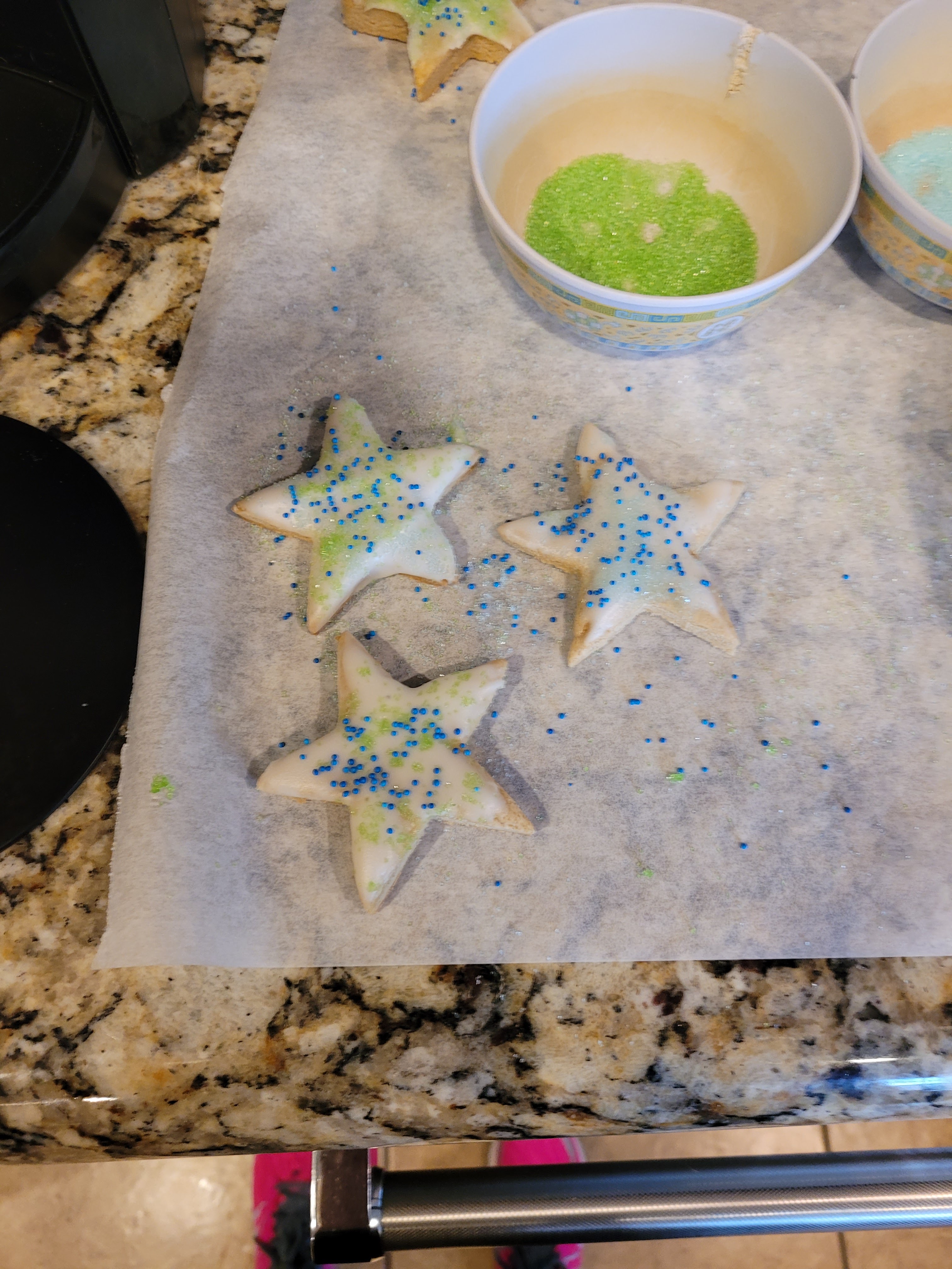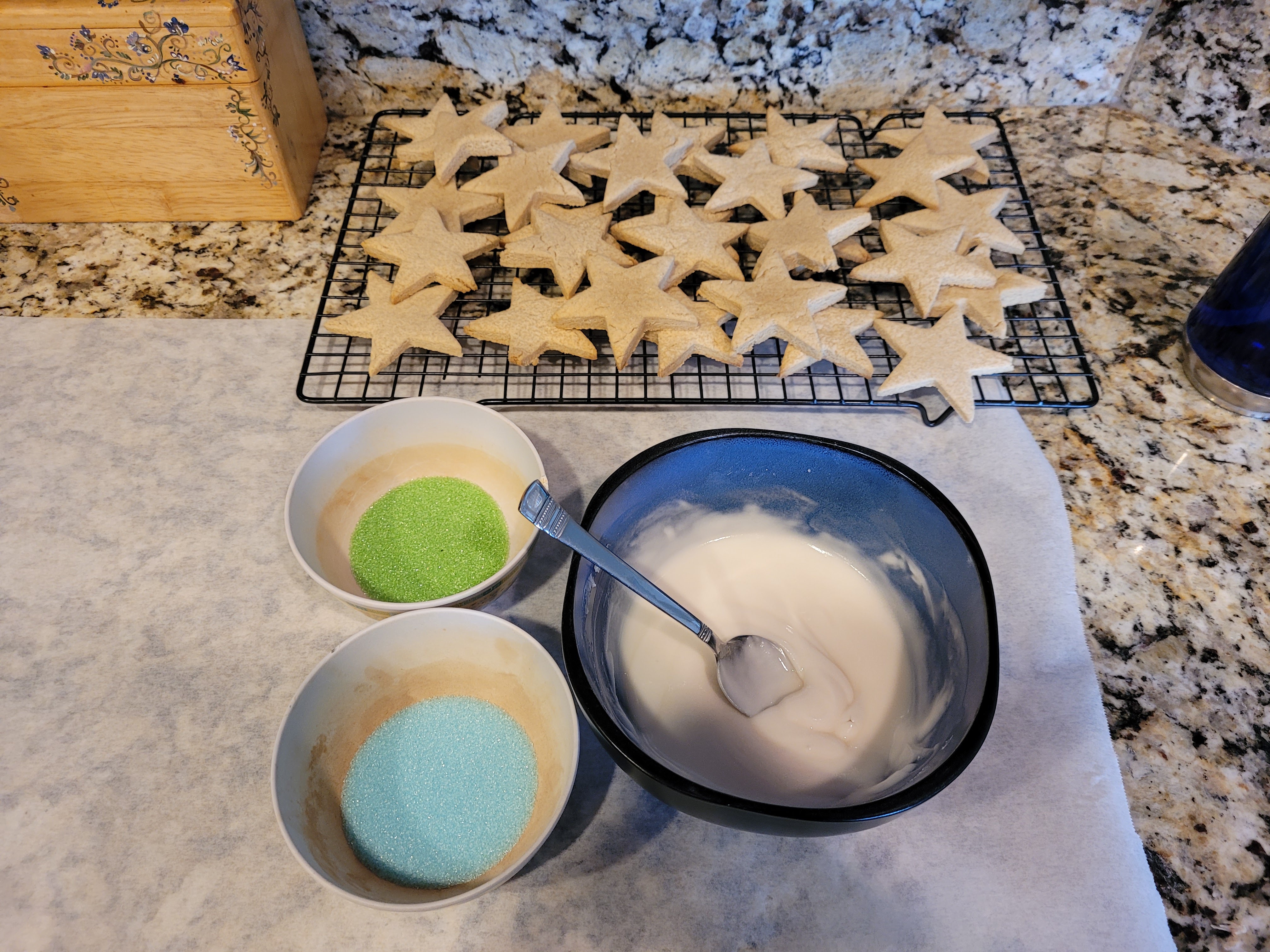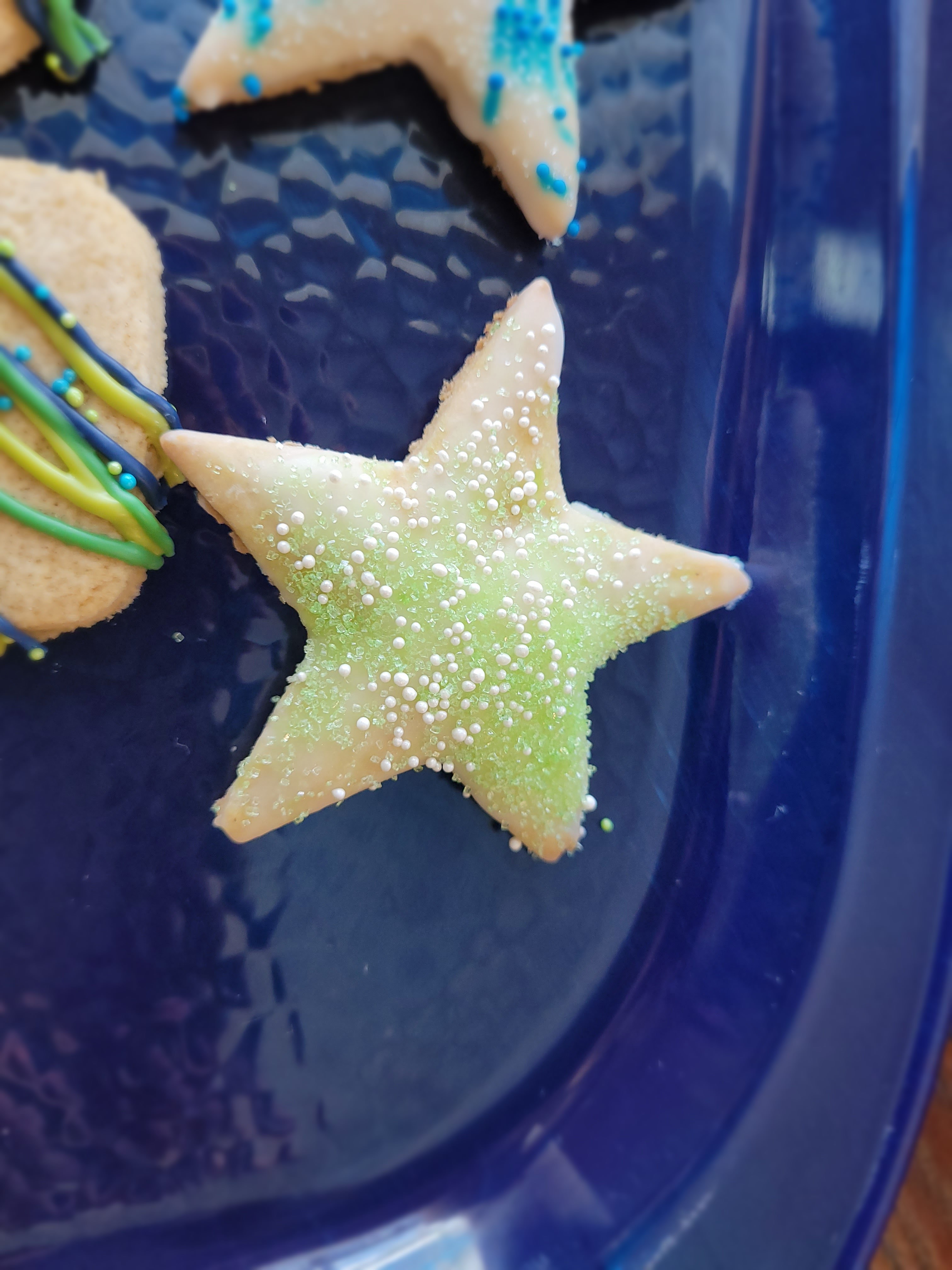 I took a star, placed it face down in the bowl of glaze, swirled around, flipped over, and tapped on the side of the bowl to get excess glaze off. Then I dusted with sanding sugar and sprinkles. Once you’ve glazed the remaining two dozen cookies, let these set and harden for 30 minutes. Plenty of time to lick that glaze bowl clean and get a little day drunk on when you do.