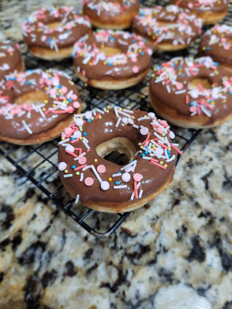 - Once donuts have cooled 5 minutes, dip into glaze and top with sprinkles
